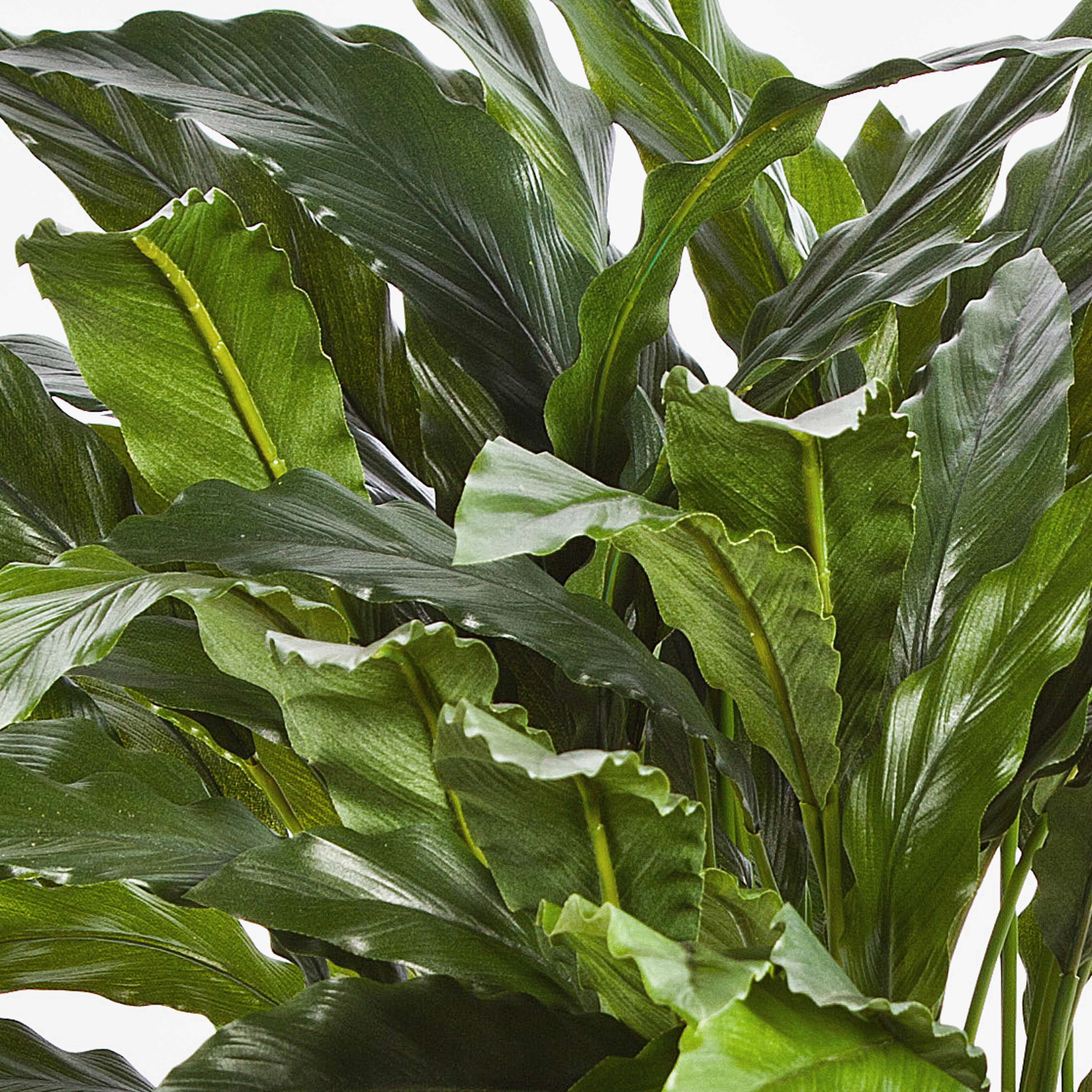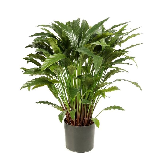 Planta Calathea artificial con 125 hojas en color verde. La planta posee una altura de 85 cm y se entrega en tiesto de cemento.
