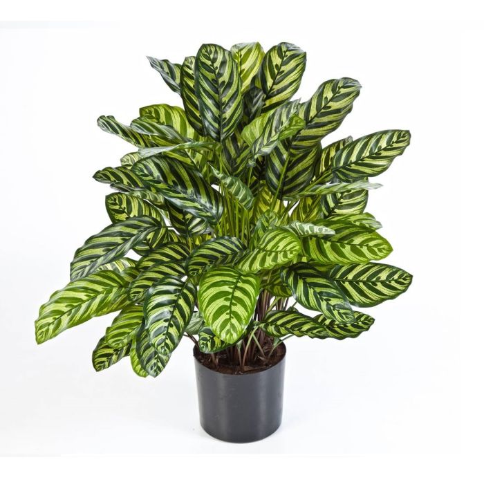 Planta Calathea artificial con 90 hojas en color verde y amarillo. La planta posee una altura aproximada de 80 cm y se entrega en tiesto de cemento.