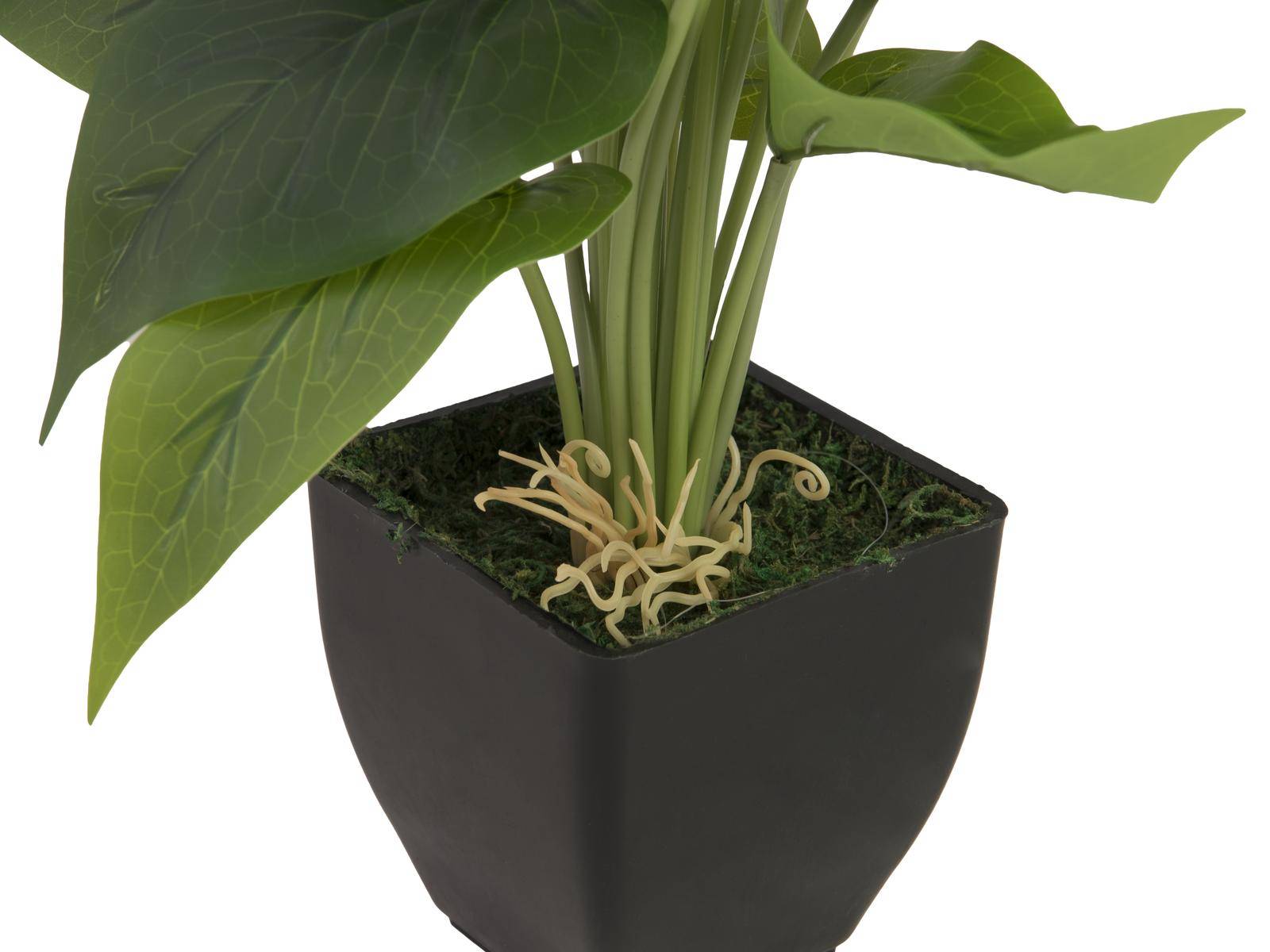 Fina flor artificial JAMILA con 3 flores en color verde-blanco. La cala se encuentra en una maceta decorativa en color negro con numerosas raíces y musgo. La pequeña planta posee en su conjunto un total de aprox. 40 cm de altura ideal para decoraciones en repisas.