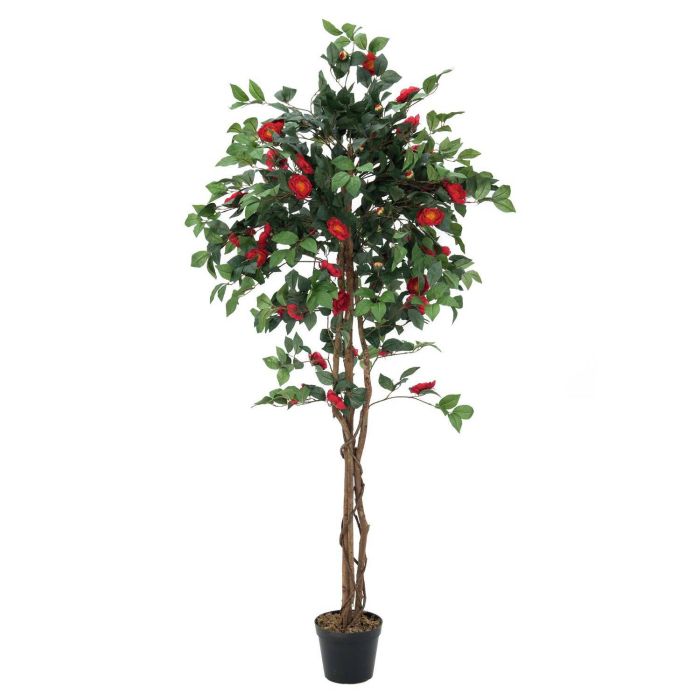 Camellia artificial con 1630 hojas, 110 flores rojas y 3 troncos entrelazados con 3 zarcillos trepadores. El árbol tiene una altura total aproximada de 180 cm.