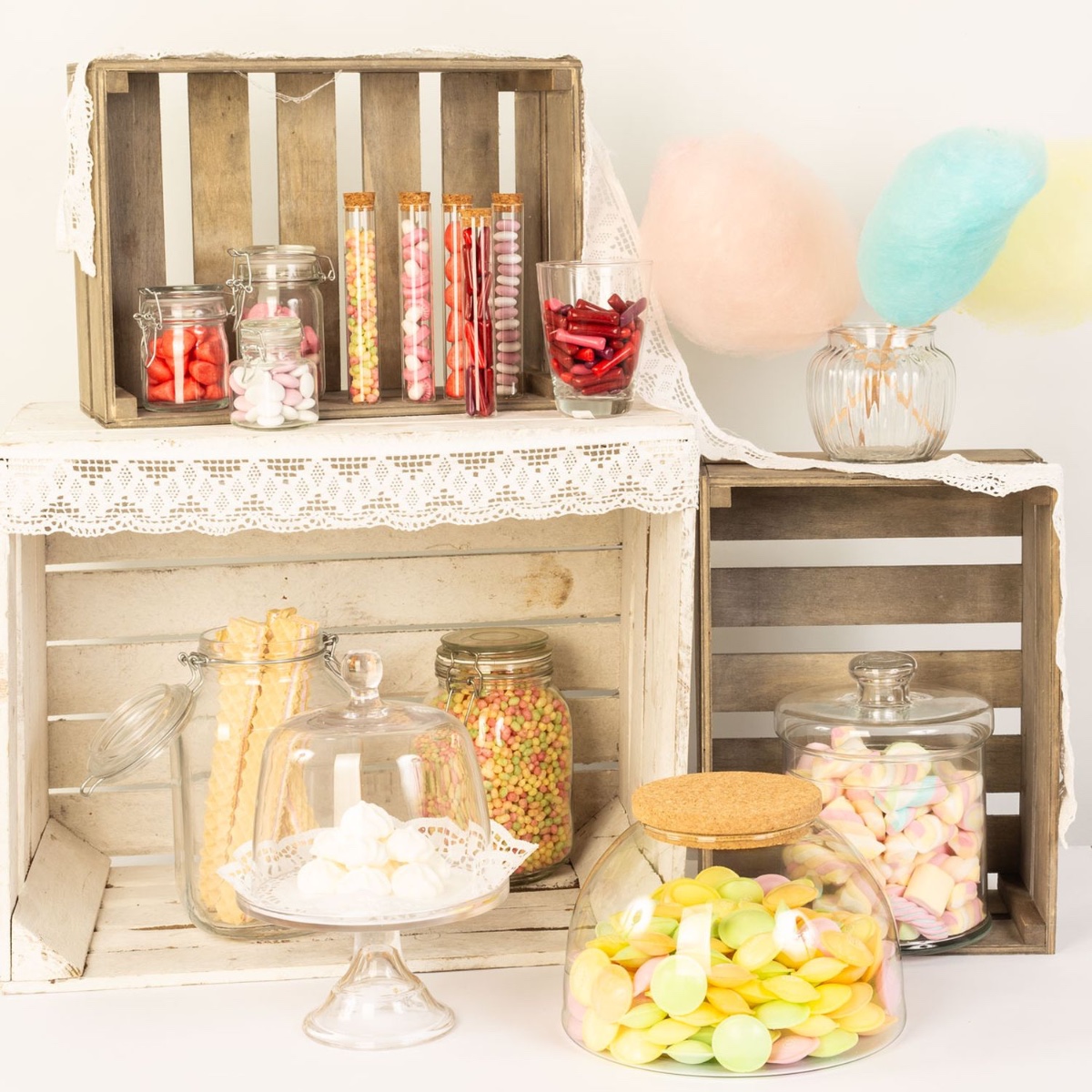 Dulces para mi dulzura, azúcar para mi amor! Una boda es un acontecimiento maravilloso que sólo se vive una vez. Cómo celebrarlo depende de ti. Sin embargo, siempre hay tendencias que aderezan las celebraciones y las hacen más modernas. Por ejemplo, un candy bar. Sentarse rígidamente a esperar el postre es cosa del pasado. Hoy en día, los novios se limitan a montar un candy bar donde cada invitado puede servirse algo dulce a su gusto. Lo bueno de esto es que los invitados pueden charlar y conocerse mejor. Y los niños también tienen un lugar de encuentro si no hay rincón infantil. Los tarros se llenan de golosinas. Aquí no hay reglas. Todo lo que sabe bien se ofrece. Nuestra amplia selección de tarros, fuentes, platos para tartas y vasos ofrece un recipiente adecuado para cada capricho. Compra el look!
