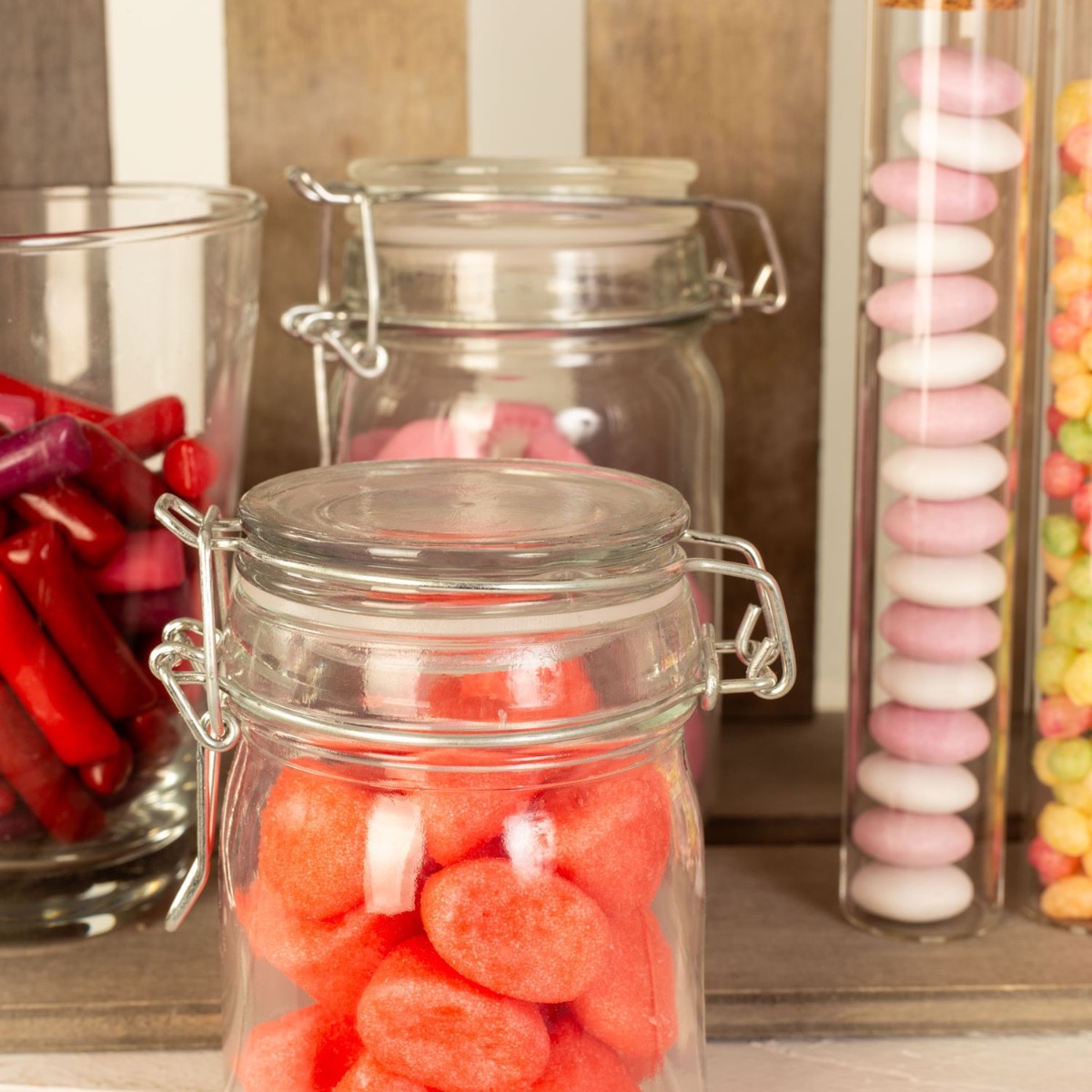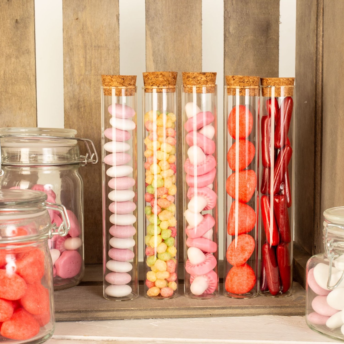 Consejo de diseño: Basta con repartir los dulces entre los distintos tarros. Las probetas también se pueden utilizar como regalo para decorar la mesa.