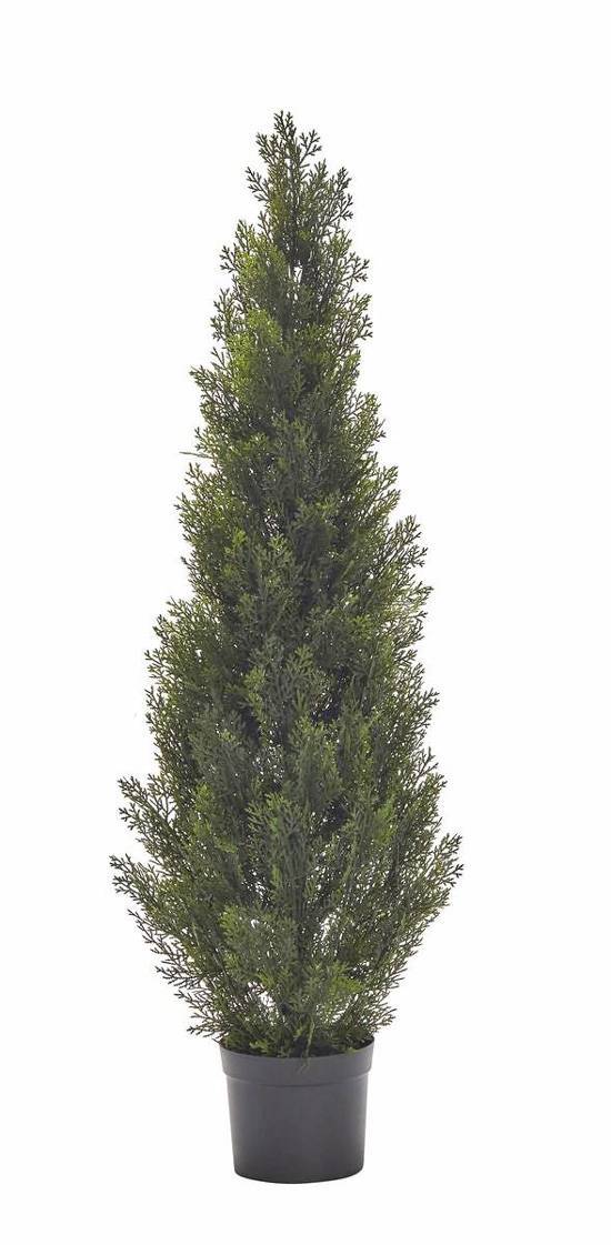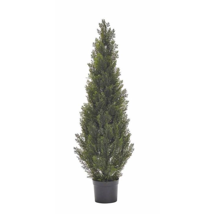 Cedro artificial en tiesto negro de plástico. La conífera posee 79 ramas llenas de ápices y tiene una altura de 120 cm.