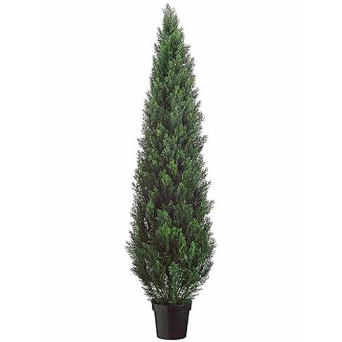 Cedro artificial en un tiesto negro de plástico. La conífera posee 180 ramas llenas de ápices y tiene una altura de 180 cm.