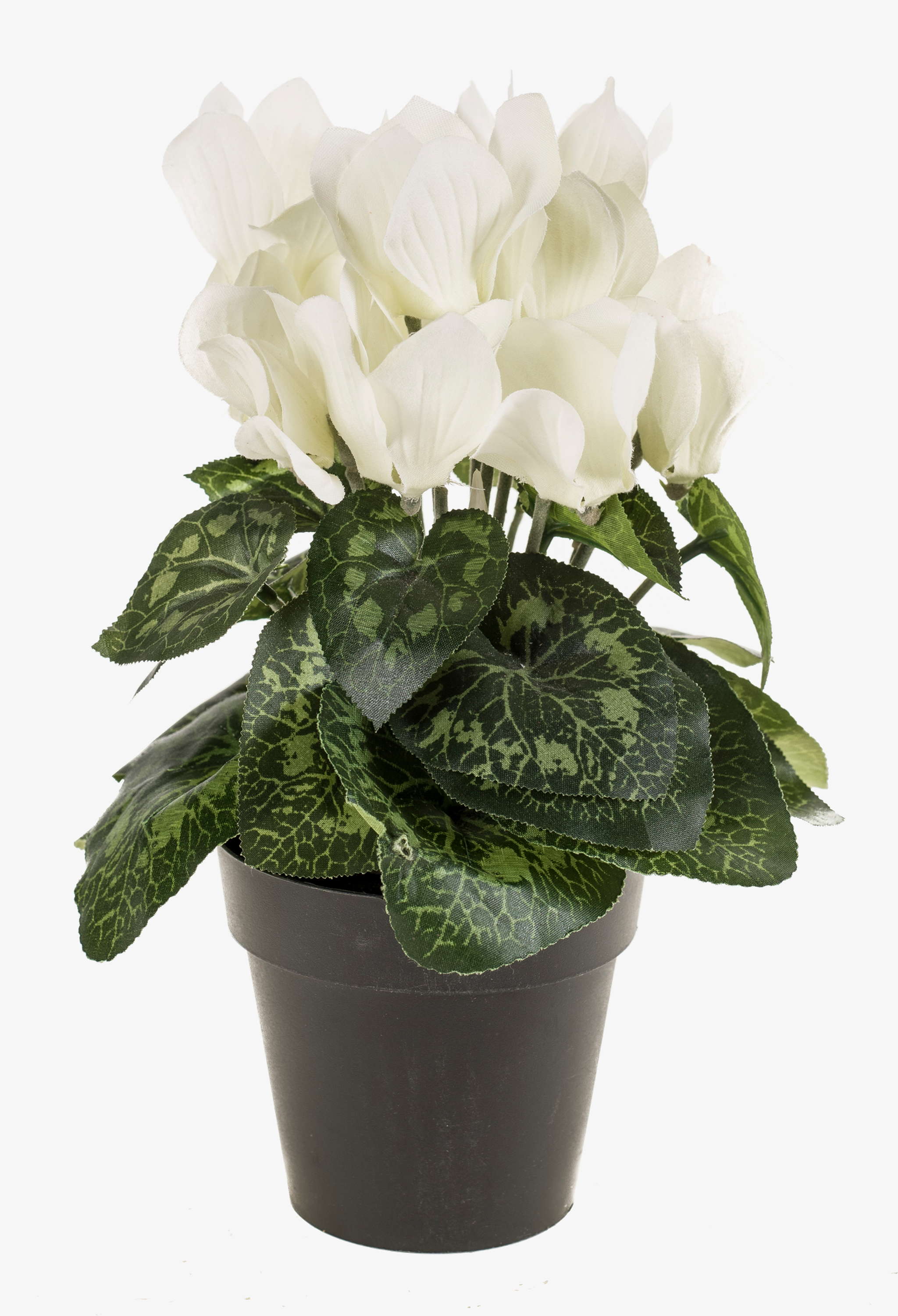 Bonito Cyclamen con 12 flores en color crema y blanco y 4 brotes. Esta planta artificial en la maceta tiene un total de unos 25 cm de alto.