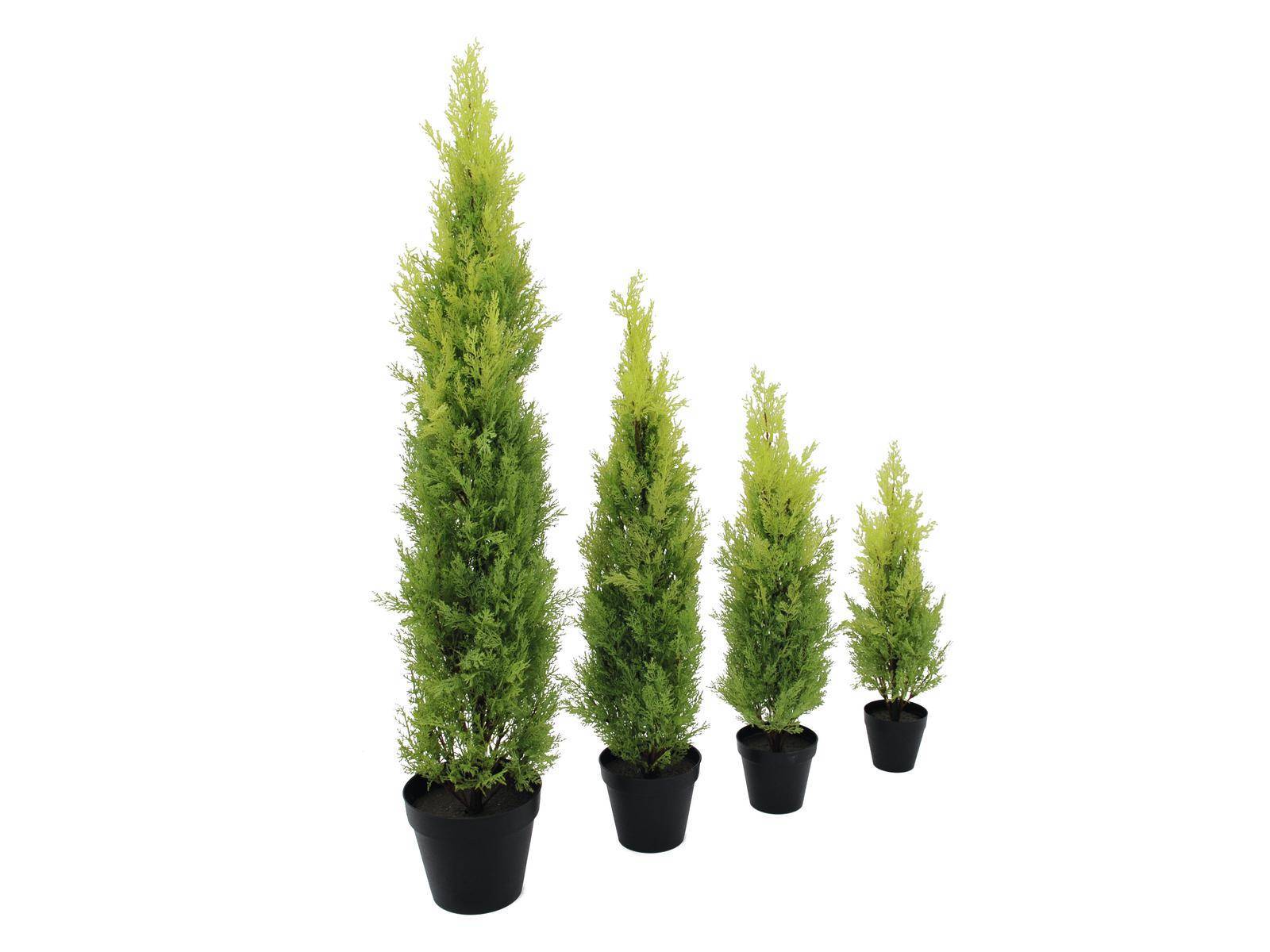 Ciprés artificial en maceta. El pequeño arbolito tiene una altura total aproximada (incl. tiesto) de 120 cm y está bien adaptado para el uso en exteriores.