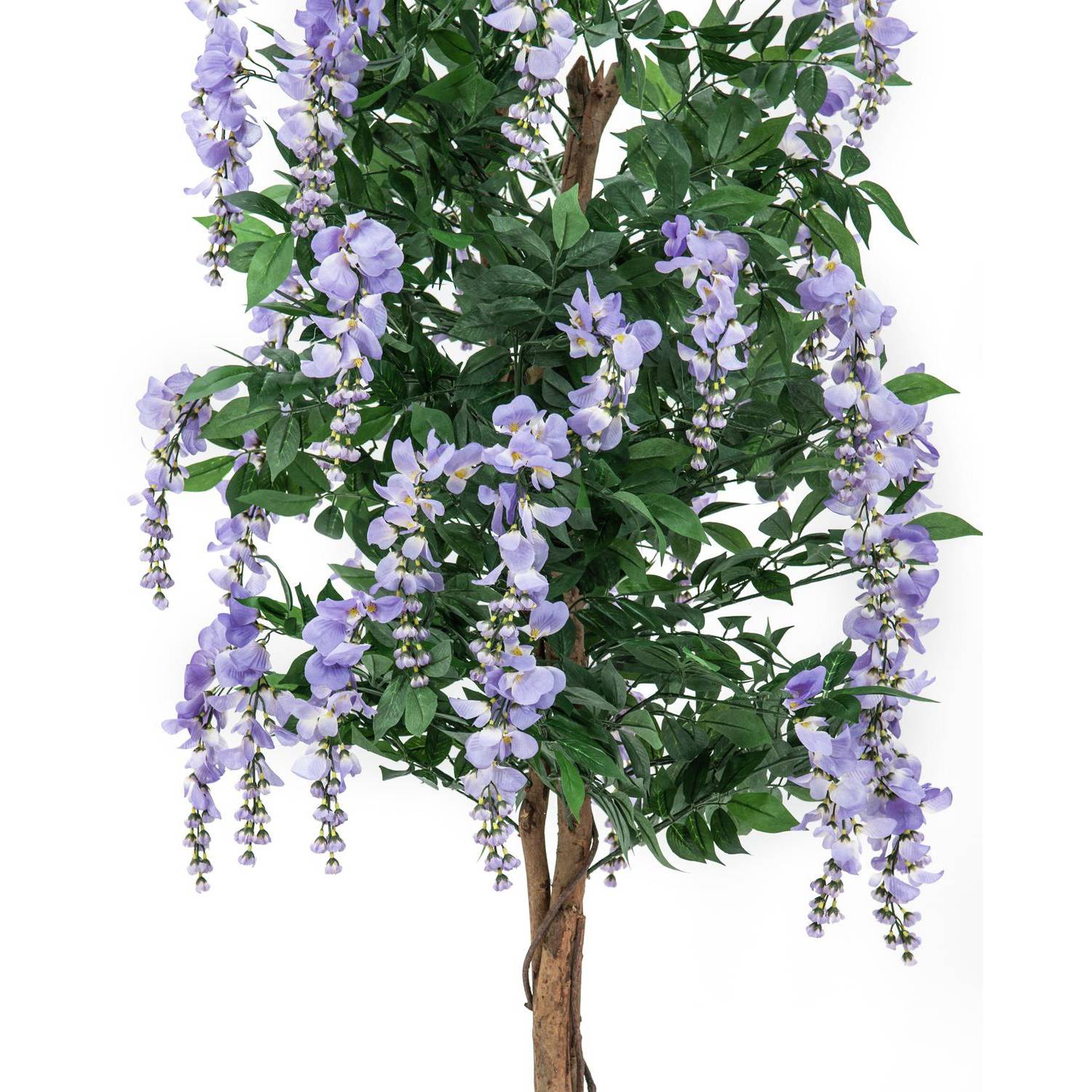 Laburno (Laburnum anagyroides o lluvia de oro) artificial con cerca de 1370 hojas y 820 flores lilas, troncos naturales y 3 zarcillos trepadores. Se entrega con maceta y tiene una altura total aproximada de 150 cm.