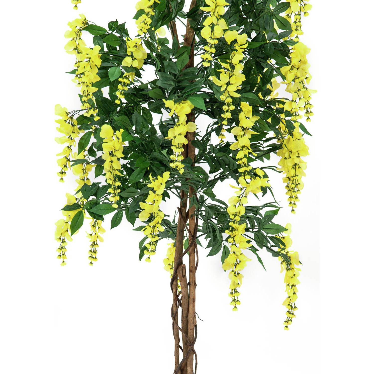 Laburno (Laburnum anagyroides o lluvia de oro) artificial con cerca de 1230 hojas y 820 flores amarillas, serpenteantes troncos naturales y 3 zarcillos trepadores. Se entrega con maceta y tiene una altura total aproximada de 150 cm.