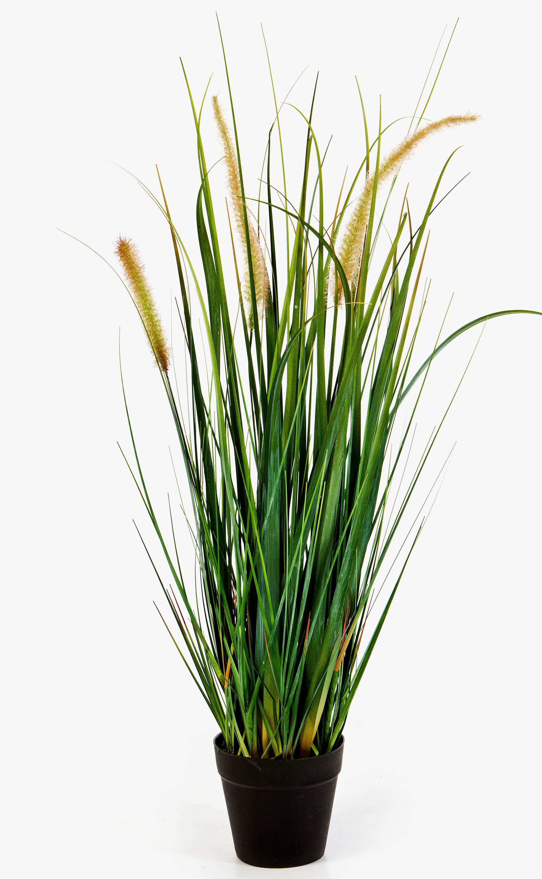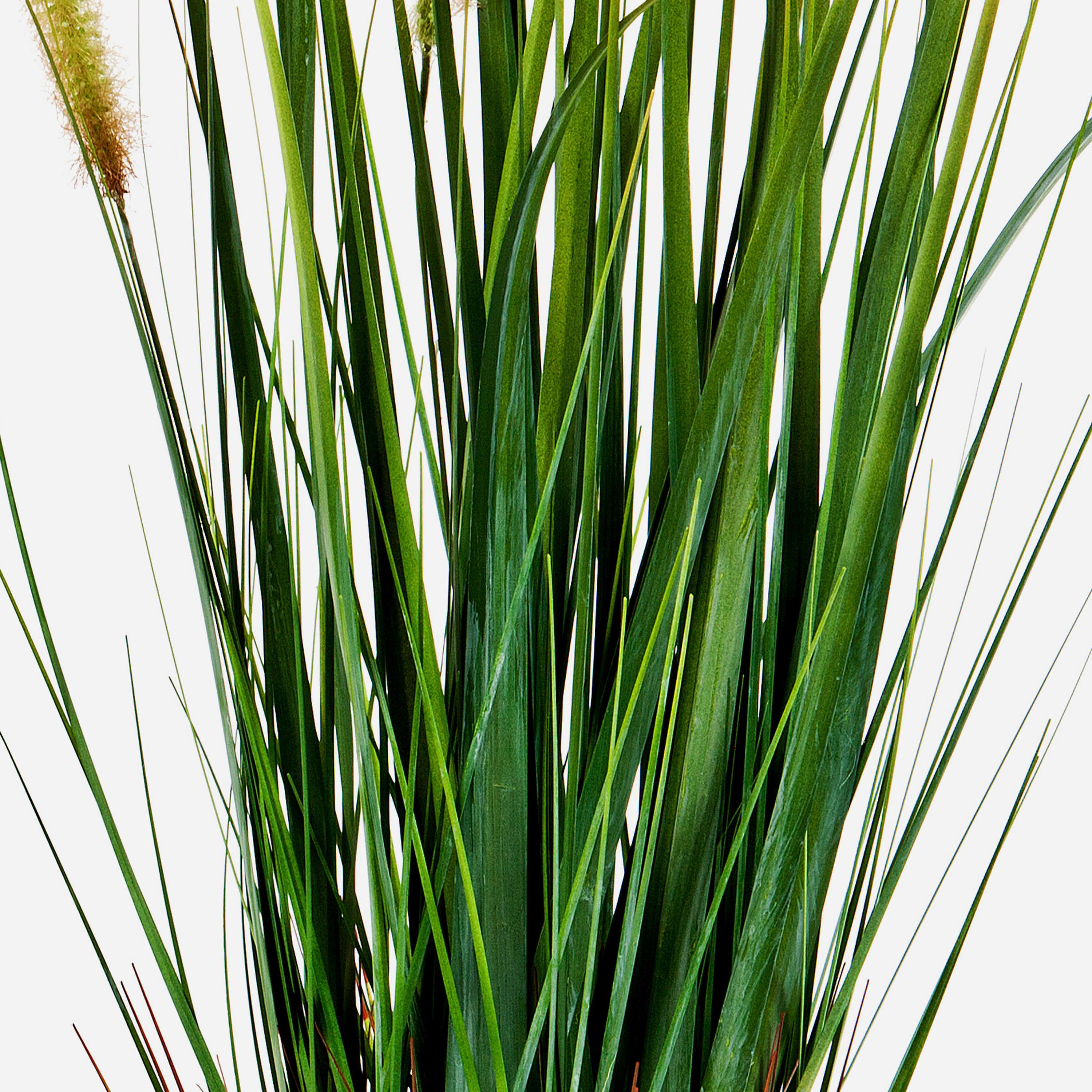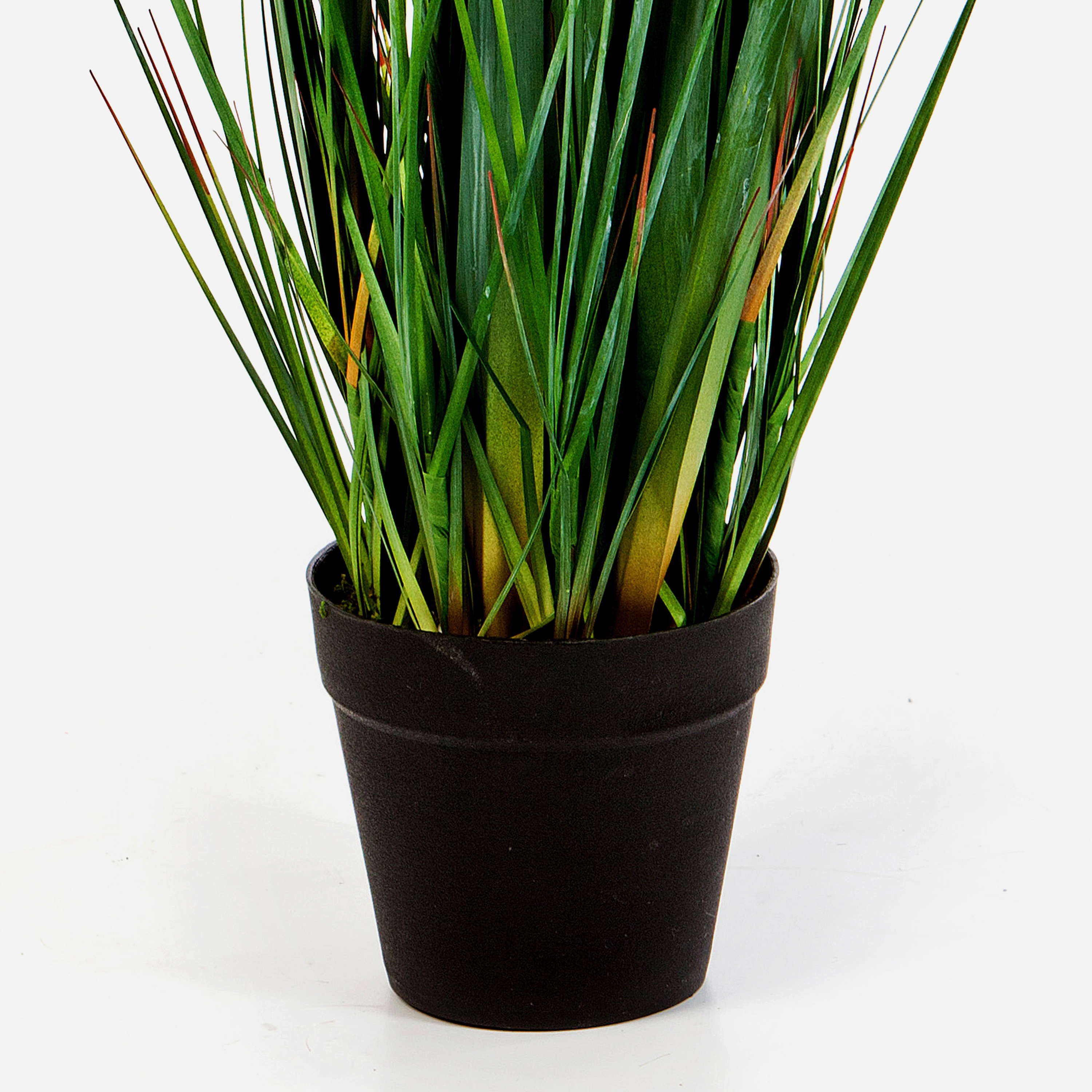 - Con hojas alargadas de diferentes tamaños con vetas que le aportan un aspecto natural, así como panojas de material sintético