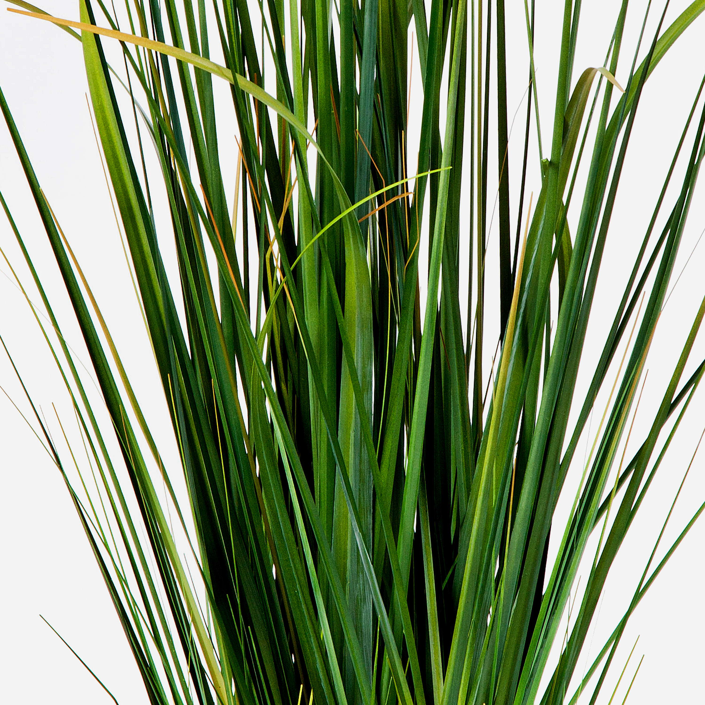 - Con hojas alargadas de diferentes tamaños con vetas que le aportan un aspecto natural, así como panojas de material sintético