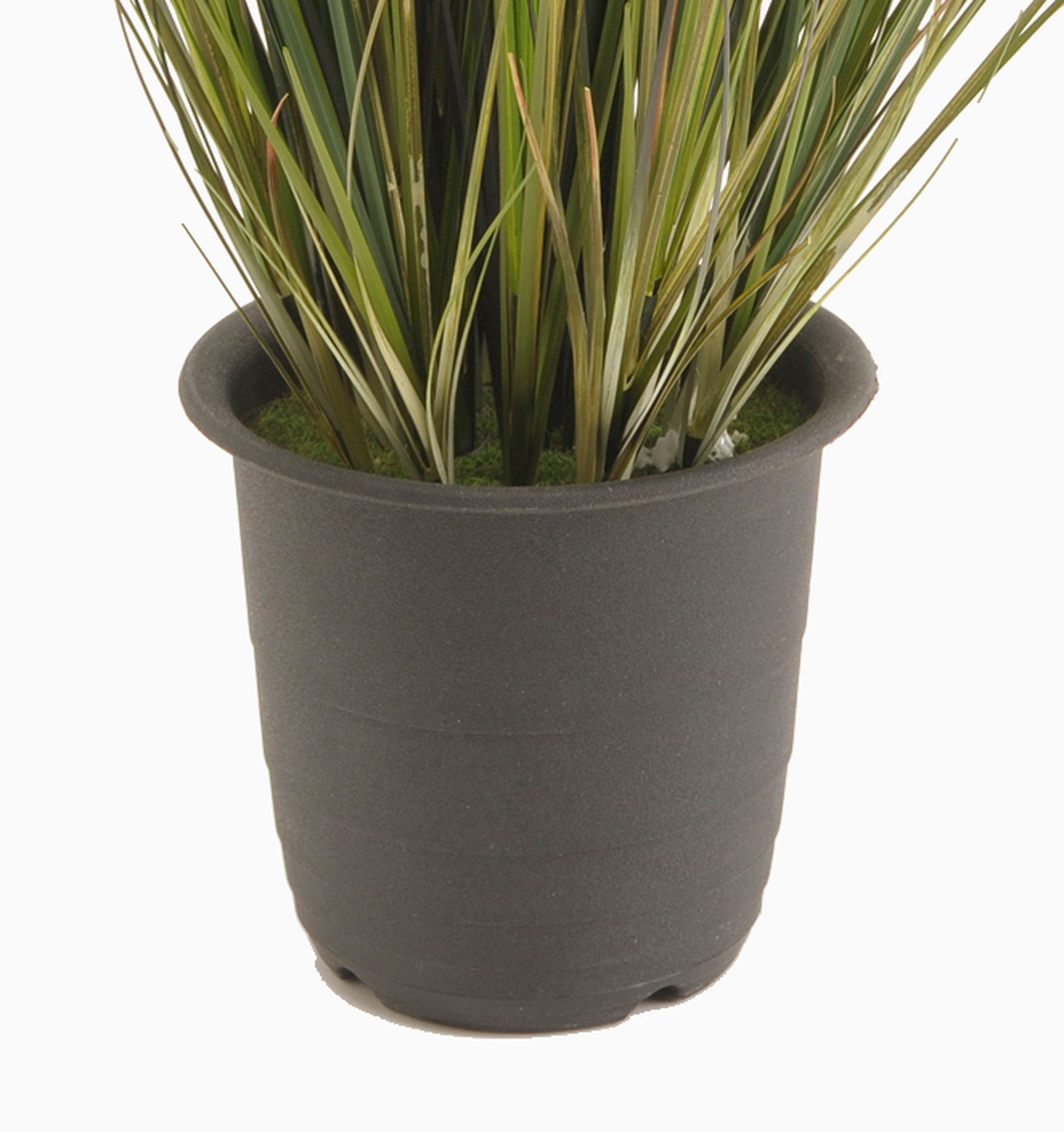 Bonito césped decorativo en tiesto. El haz de hierba artificial es de color verde y tiene una altura total de unos 45 cm.