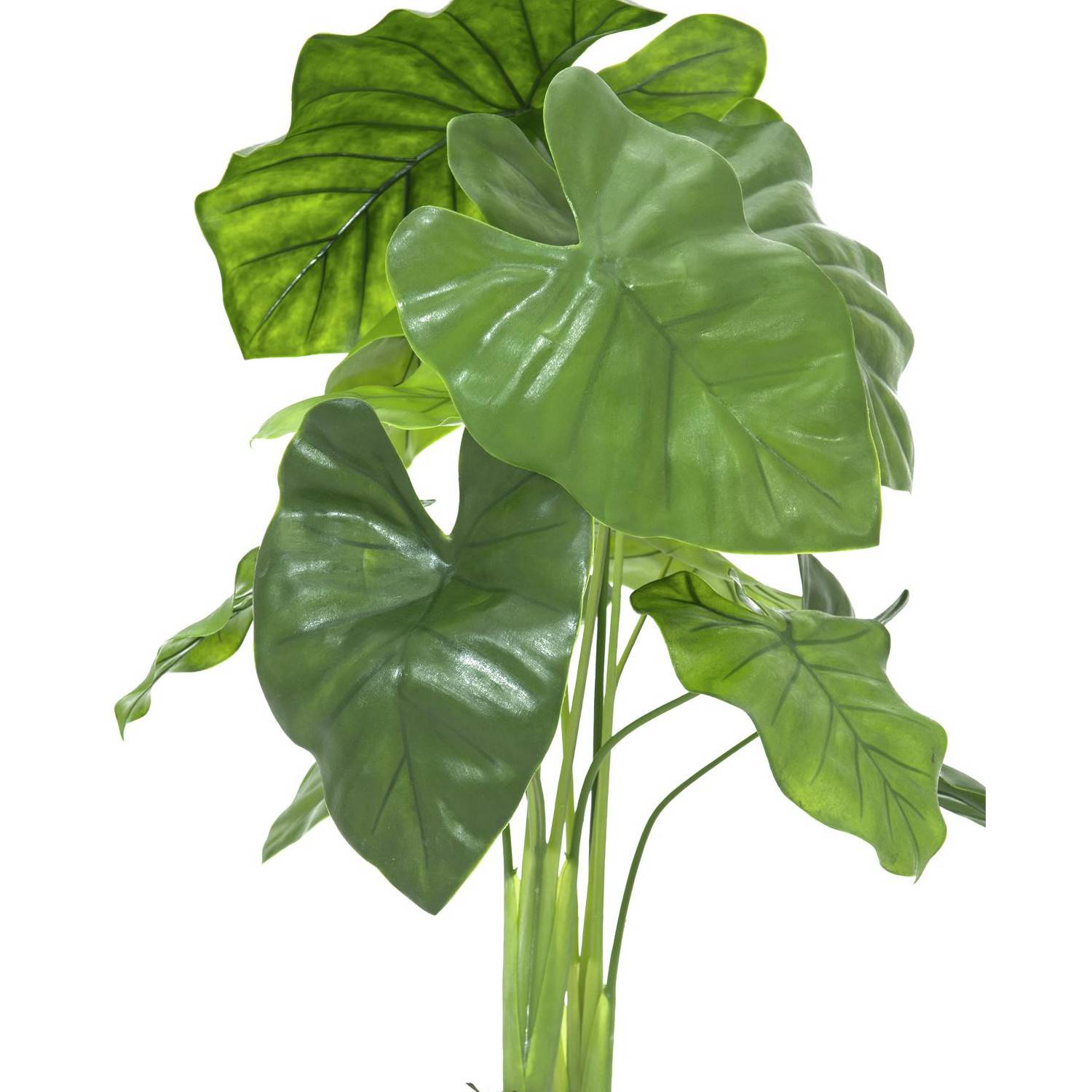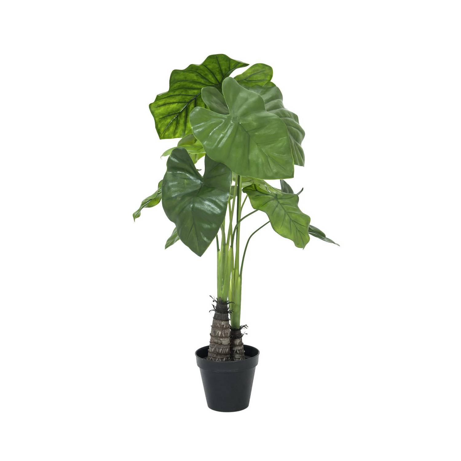 Alocasia artificial con 12 hojas y 2 troncos en un tiesto decorativo de color negro. La planta artificial está adaptada para el uso en exteriores y posee una altura de 90 cm.