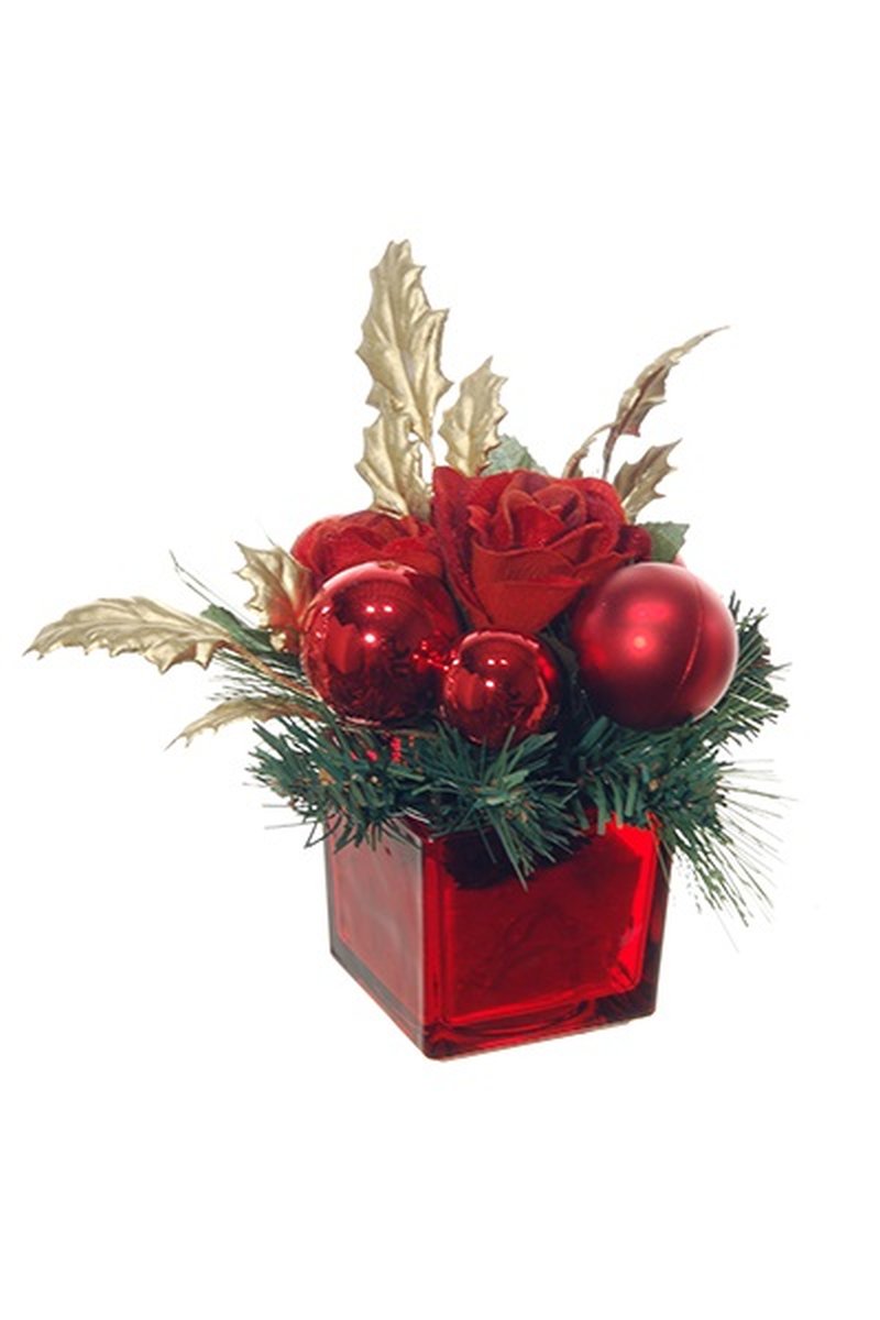 Composición artificial de rosa, pino, acebo HALANA con bolas, vidrio decorativo, rojo-dorado, 13cm, Ø19cm