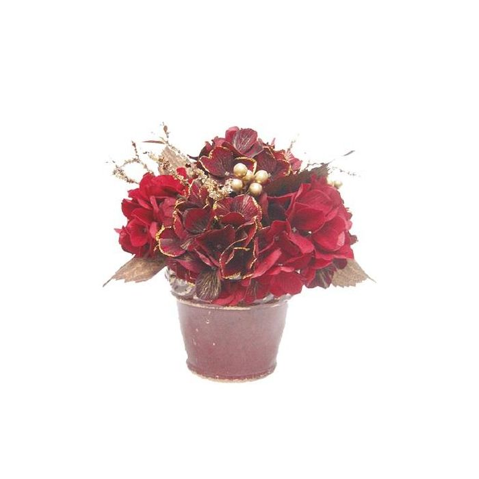 Composición de flores artificiales de Hortensia, Baya SUKI, maceta decorativa, rojo-dorado, Ø25cm