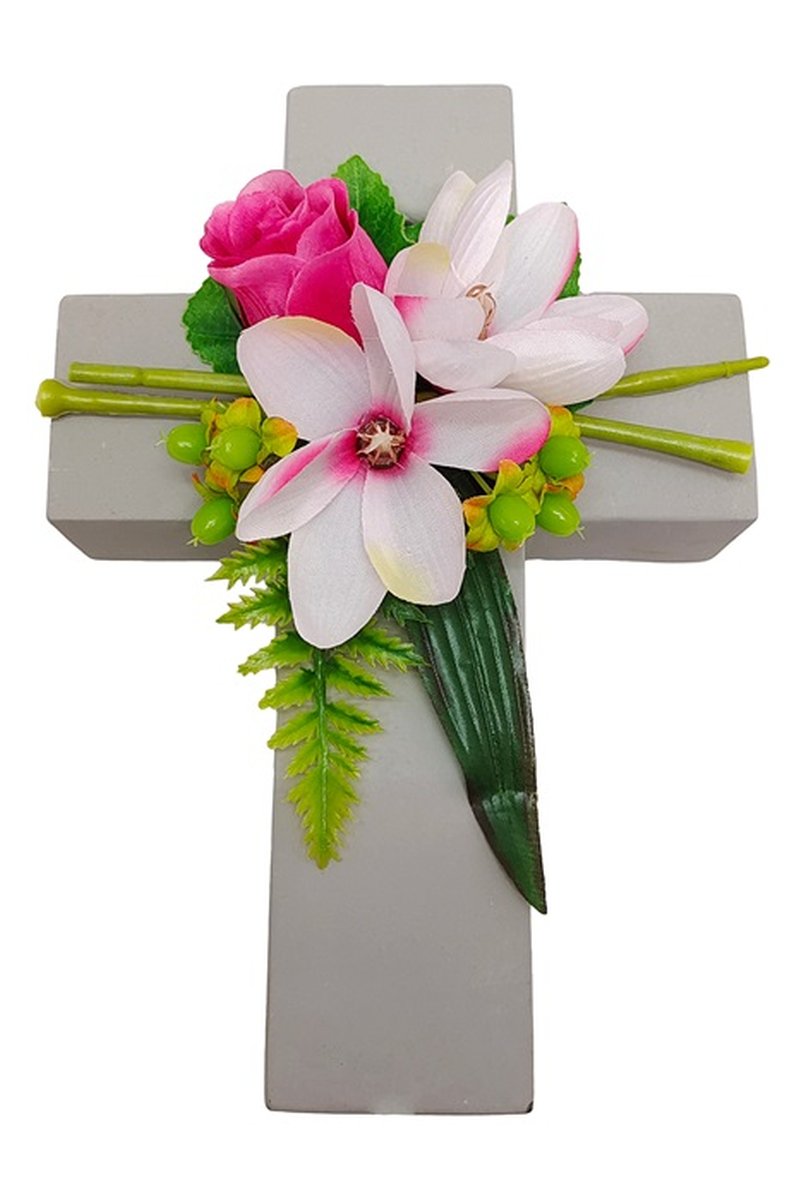 - El arreglo floral de buen gusto en una cruz es un hermoso enriquecimiento por ejemplo para la decoración de la tumba.Tenga en cuenta que no podemos dar ninguna garantía de longevidad y durabilidad para el uso al aire libre, las flores artificiales pueden decolorarse debido a la radiación UV, volverse quebradizas o arrancarse por el viento