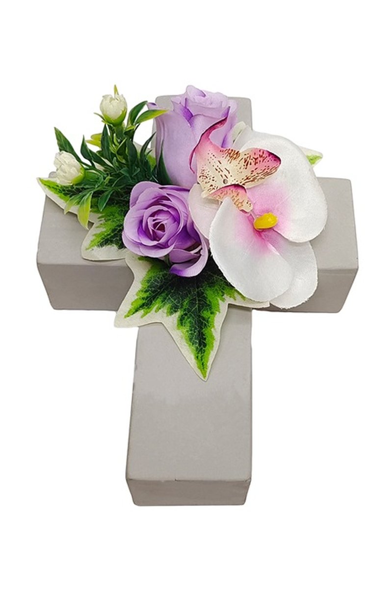 - El arreglo floral de buen gusto en una cruz es un hermoso enriquecimiento por ejemplo para la decoración de la tumba.Tenga en cuenta que no podemos dar ninguna garantía de longevidad y durabilidad para el uso al aire libre, las flores artificiales pueden decolorarse debido a la radiación UV, volverse quebradizas o arrancarse por el viento