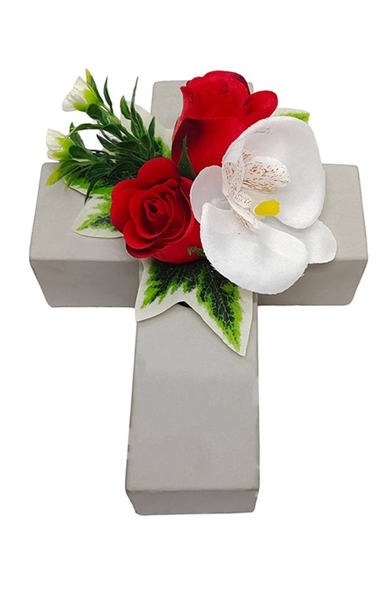 - El arreglo floral de buen gusto en una cruz es un hermoso enriquecimiento por ejemplo para la decoración de la tumba.Tenga en cuenta que no podemos dar ninguna garantía de longevidad y durabilidad para el uso al aire libre, las flores artificiales pueden decolorarse debido a la radiación UV, volverse quebradizas o arrancarse por el viento