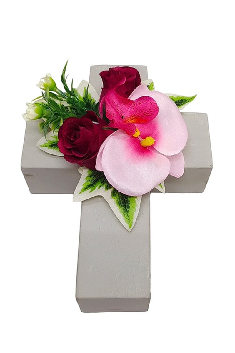- El arreglo floral de buen gusto en una cruz es un hermoso enriquecimiento por ejemplo para la decoración de la tumba.Tenga en cuenta que no podemos dar ninguna garantía de longevidad y durabilidad para el uso al aire libre, las flores artificiales pueden decolorarse debido a la radiación UV, volverse quebradizas o arrancarse por el viento