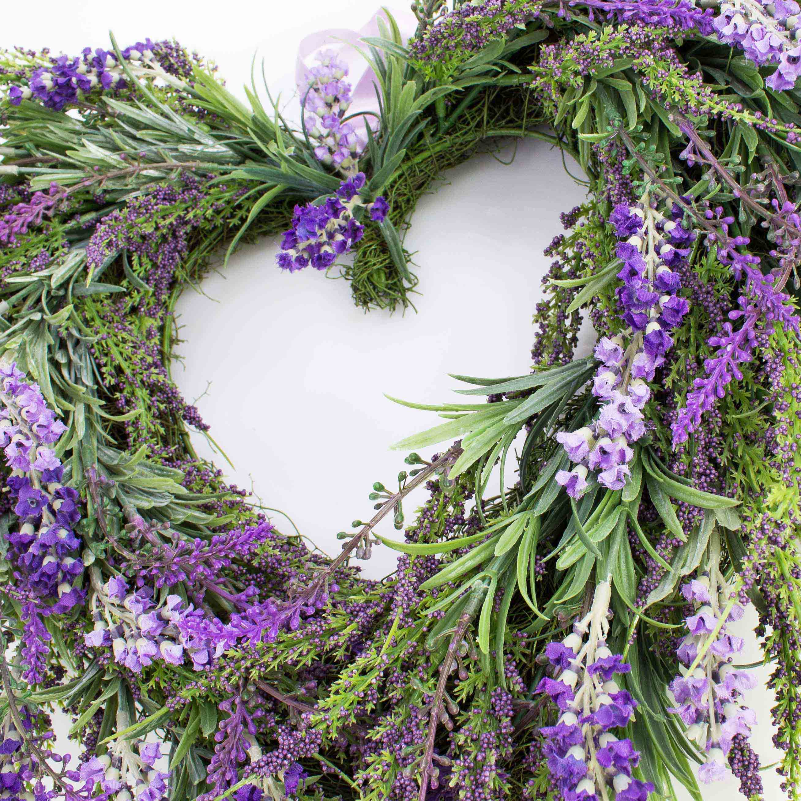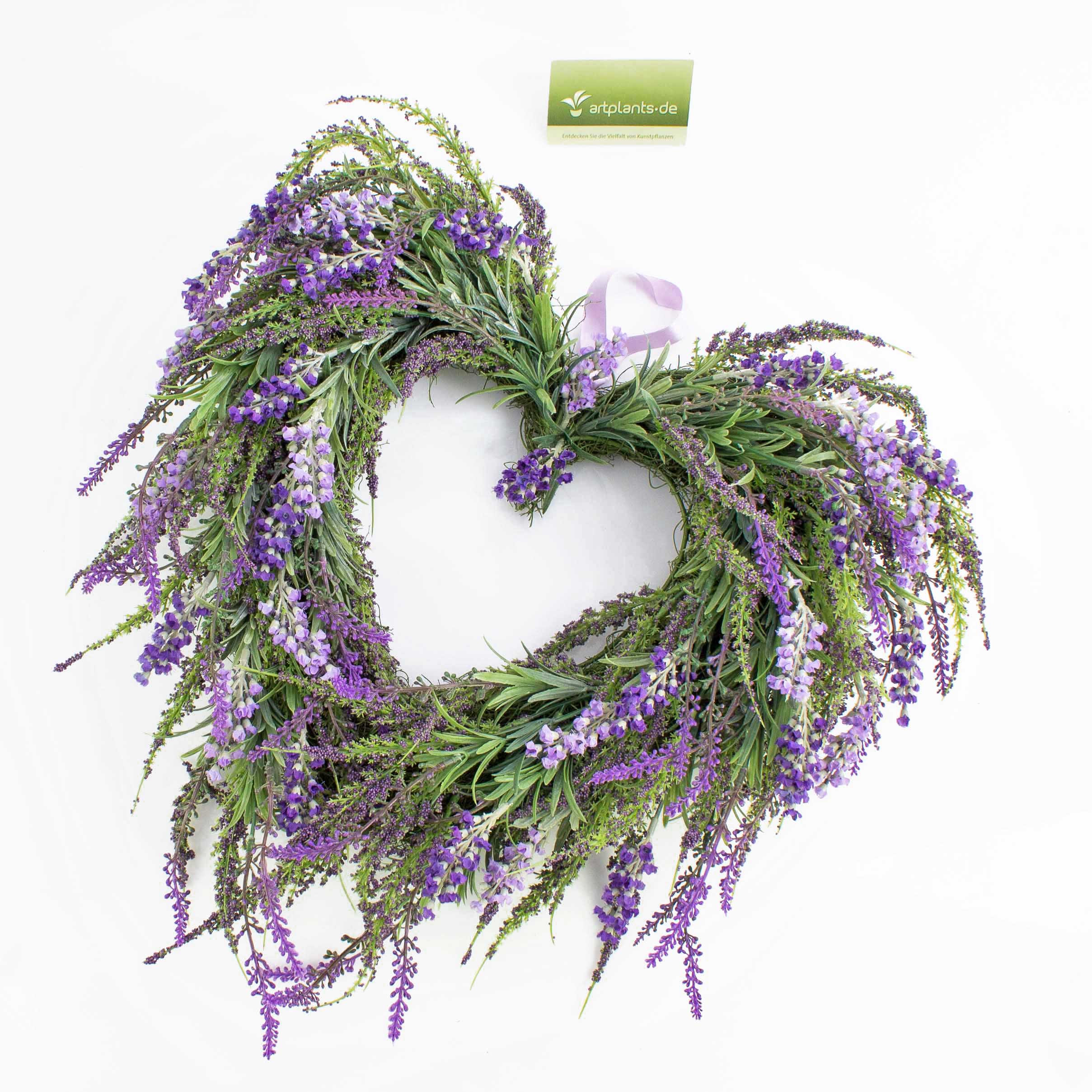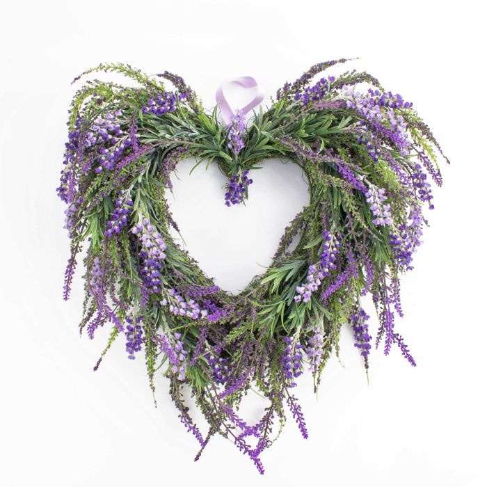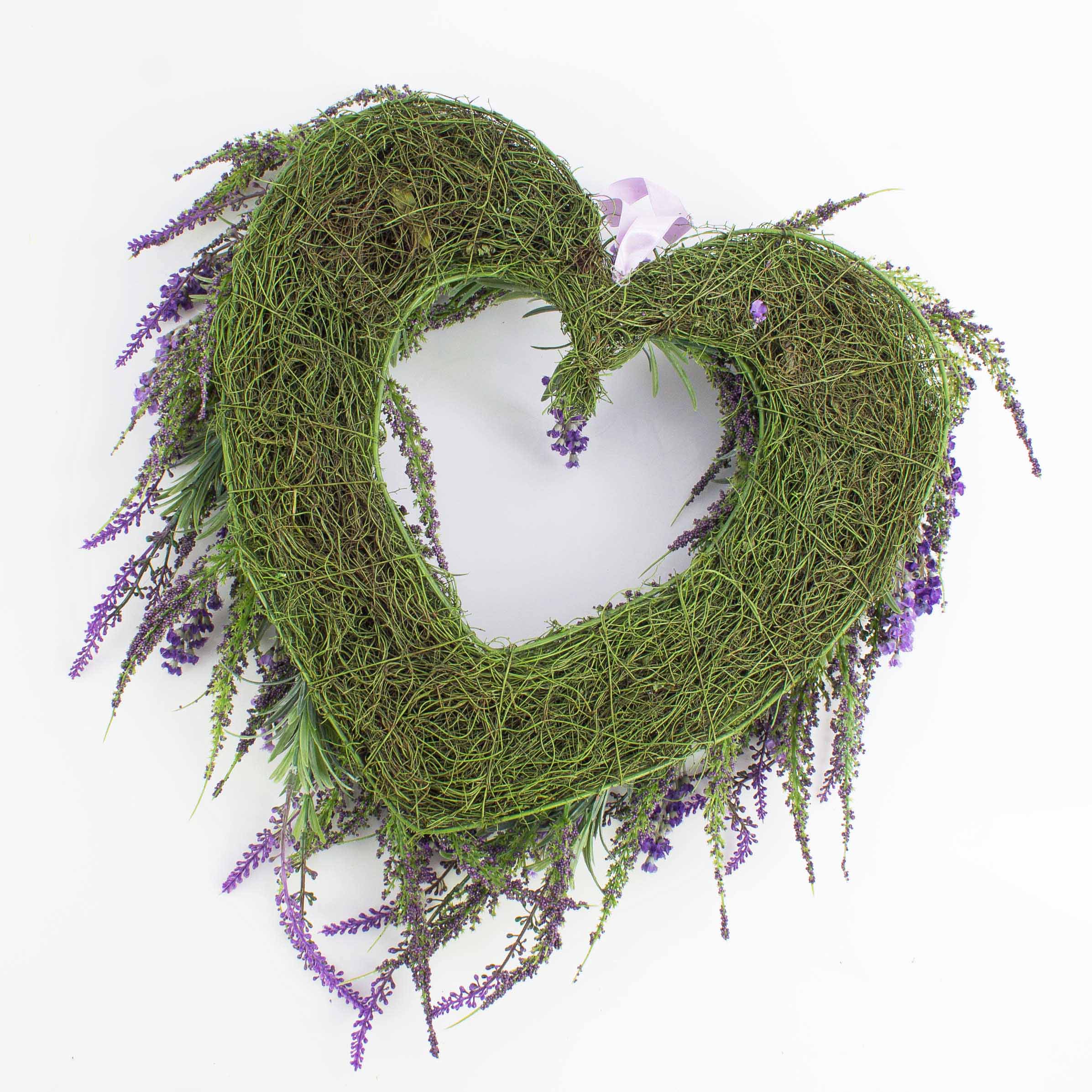 Corazón de lavanda (Lavandula) artificial. La corona mide un diámetro total de unos 45 cm y es ideal como guirnalda en la puerta o como elemento decorativo en la mesa.