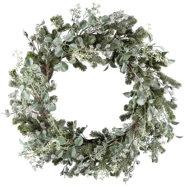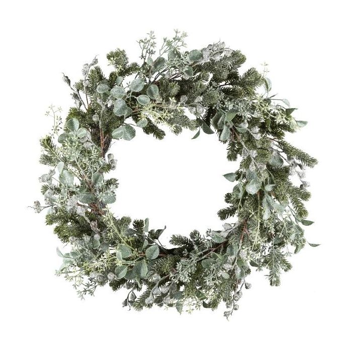 Corona artificial de eucalipto, abeto DUVRA con flores, congelada, verde grisáceo, Ø 60 cm