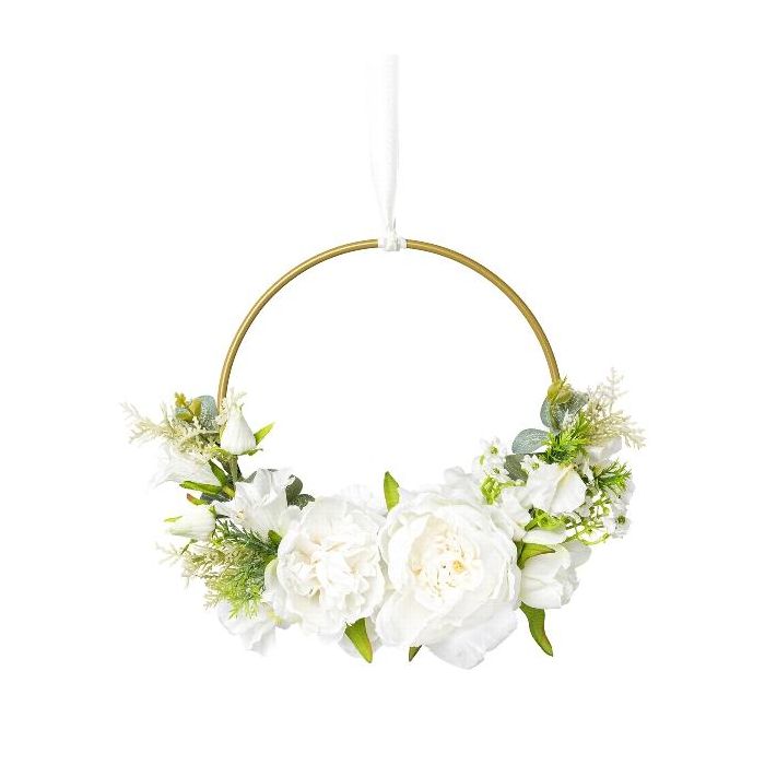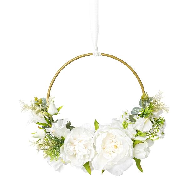 Corona de flores artificiales de peonía y campanilla KEFRO, blanca, Ø 25 cm