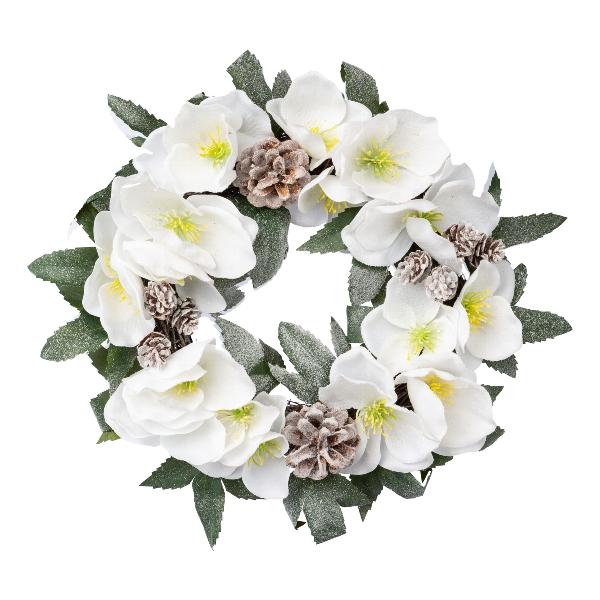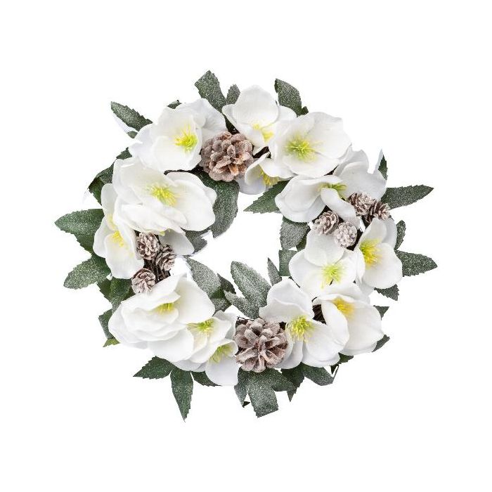 Corona de flores decorativa rosa de Navidad FOGRA, piñas, congelada, blanca, Ø 30 cm