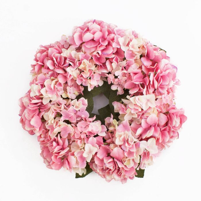 Fina corona de hortensias en color rosa. La corona artificial posee un diámetro aproximado de 35 cm y es un elemento decorativo ideal para mesas, puertas o paredes en época primaveral y estival.