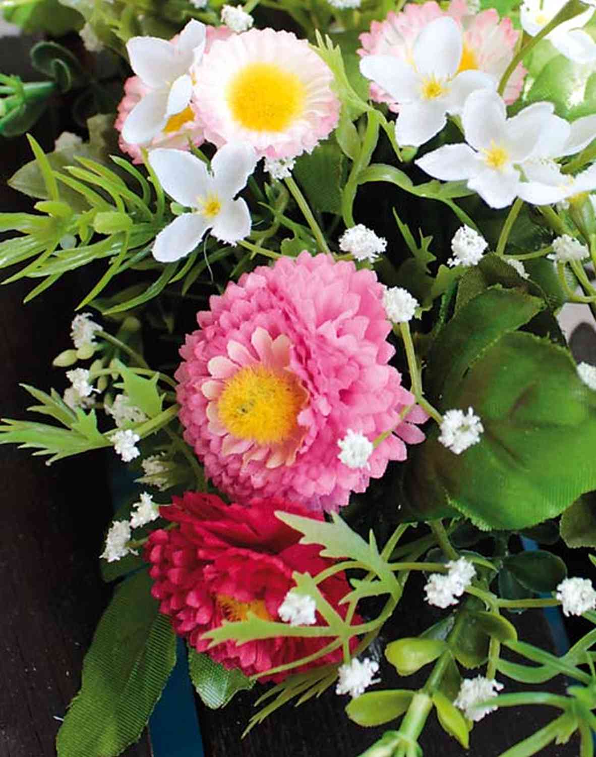 La corona de bellis decorativo TARJA de color rosa-blanco posee un diámetro total de 30 cm. La alta calidad en su elaboración y el aspecto natural de la corona artificial la convierten en un adorno especial para la primavera y el verano, como una corona de mesa, puerta o pared.
