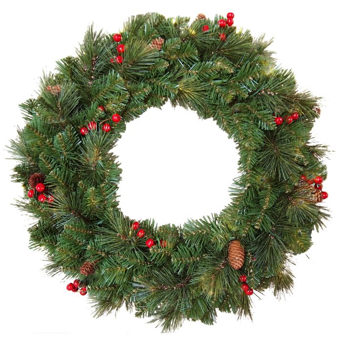 La corona artificial BUKAREST está decorada con grosellas rojas y piñas. Las ramas de agujas artificiales de color verde son plegables y pueden doblarse individualmente para darles forma.