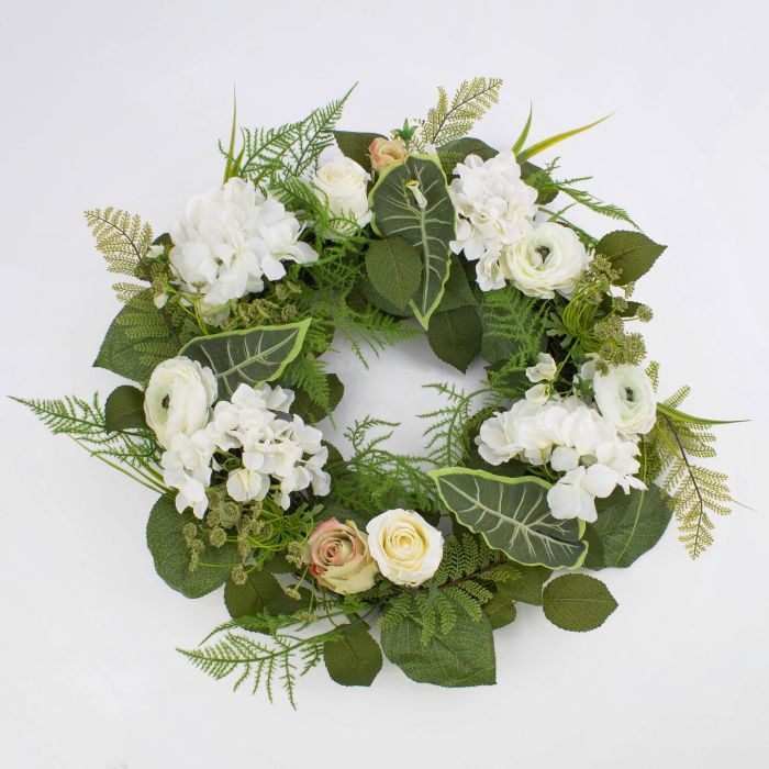 Decorativa corona estival de ranúnculos, rosas y hortensias