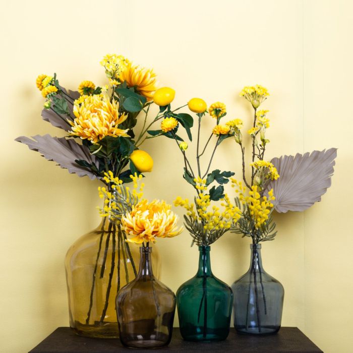 ...¡las posibilidades son infinitas! ¿Una rama de limón como parte de un ramo? ¡Eso sólo es posible con artplants! ¡Nuestro look es muy amarillo! Y eso es lo que queríamos conseguir con este look. El amarillo es el color de la alegría y la positividad. Este es también el efecto de nuestro look, compuesto por crisantemos, mimosas y flores de arce. Enmarcado por una hoja de palmera, el colorido queda discretamente en segundo plano y da aún más luminosidad a las flores. Los frascos globo de cristal están disponibles en tantos colores que combinan con todo. Compre el look!