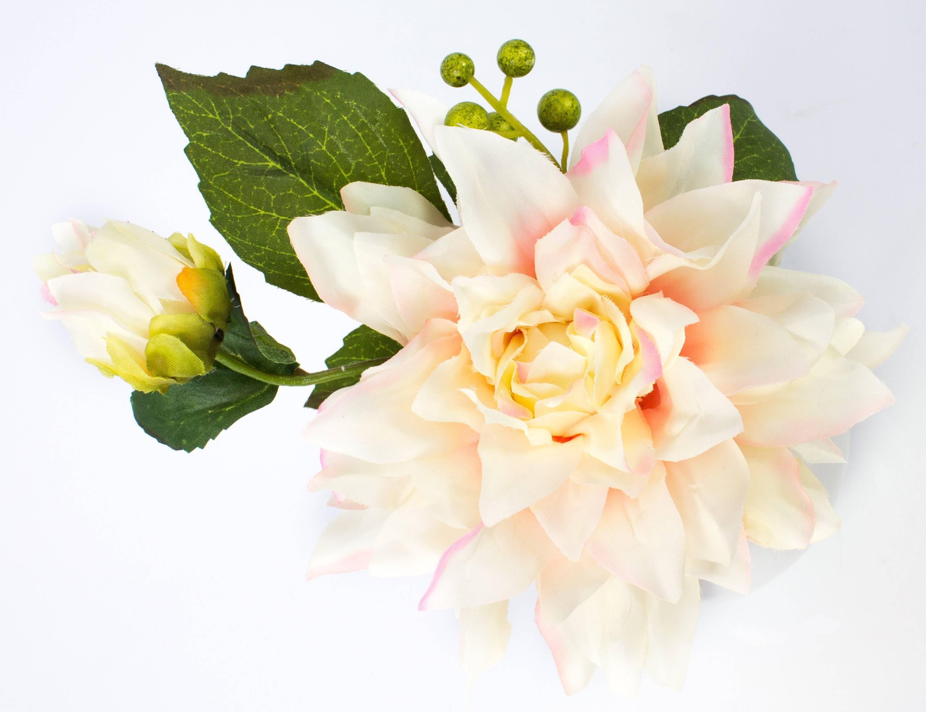 - Con una flor y un capullo de dalia en color rosa crema, así como hojas y una rama de bayas verdes