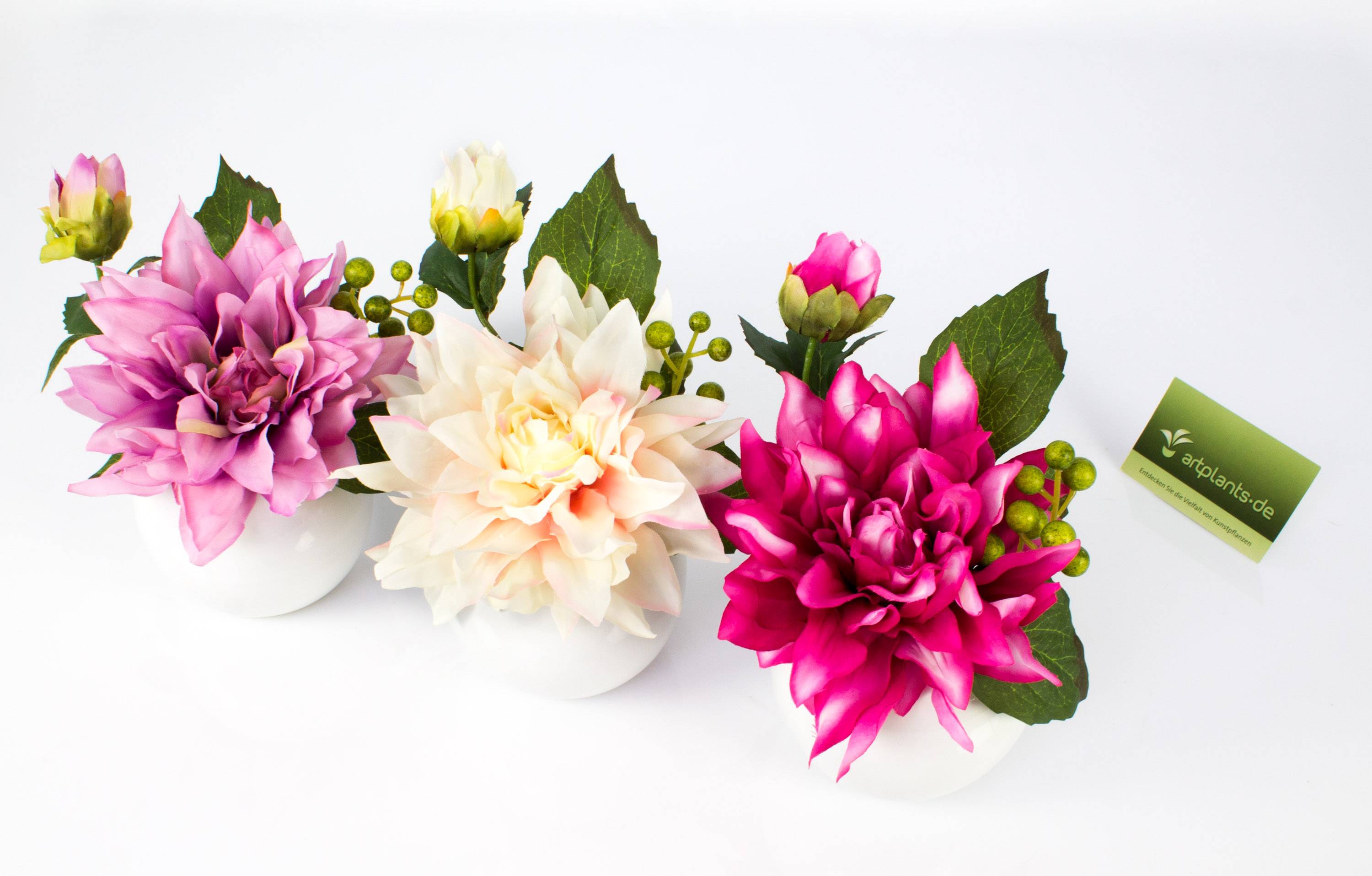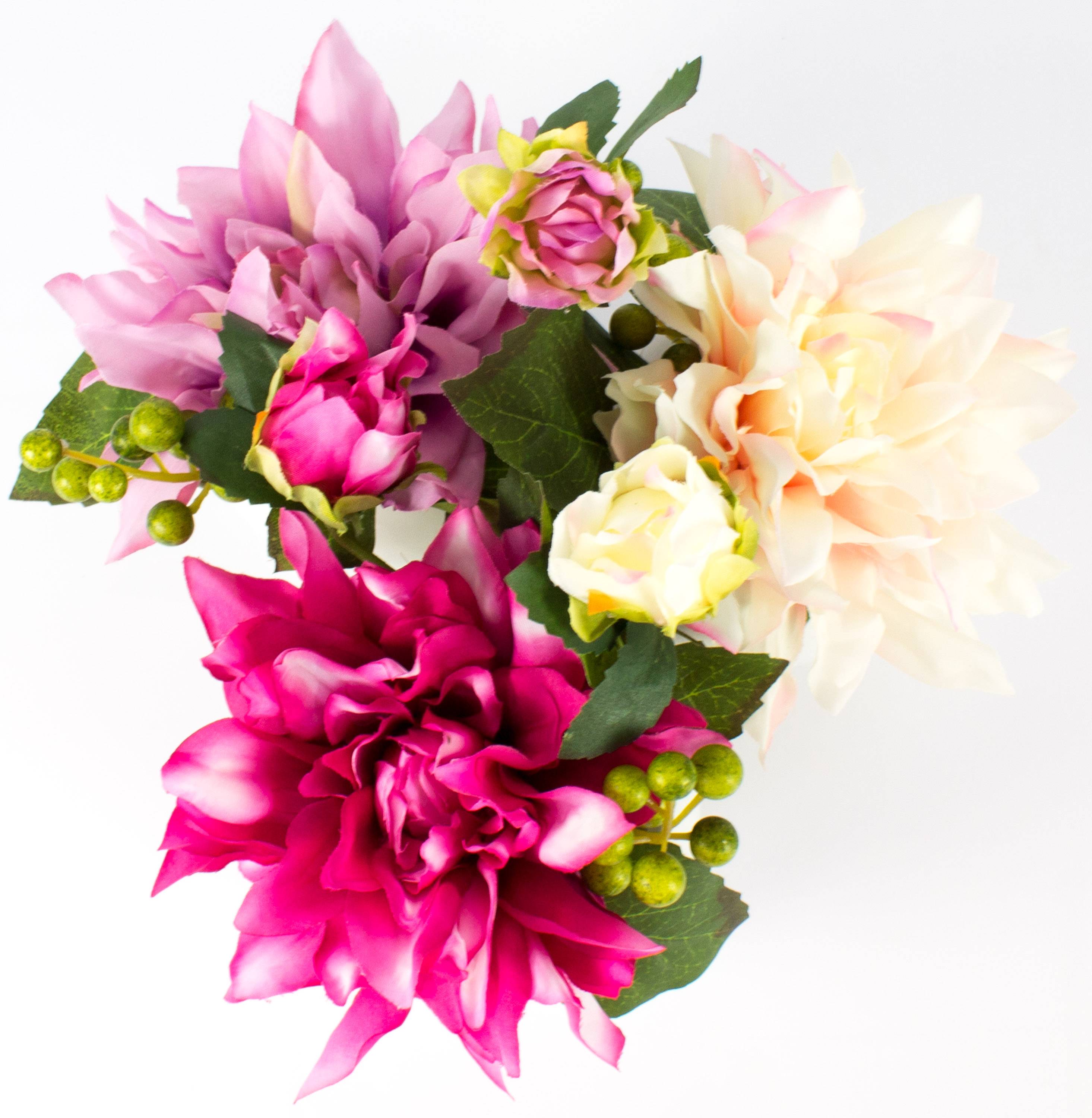 Bonito arreglo de dalia de plástico, brote y rama de bayas con una altura total de aprox. 20 cm.