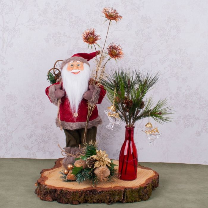 Consejo de decoración: La zinnia roja se coloca en la mano de Papá Noel. Coloca la rama de pino en el jarrón y pégale los adornos del árbol de Navidad. Coloca todo en el disco del árbol.