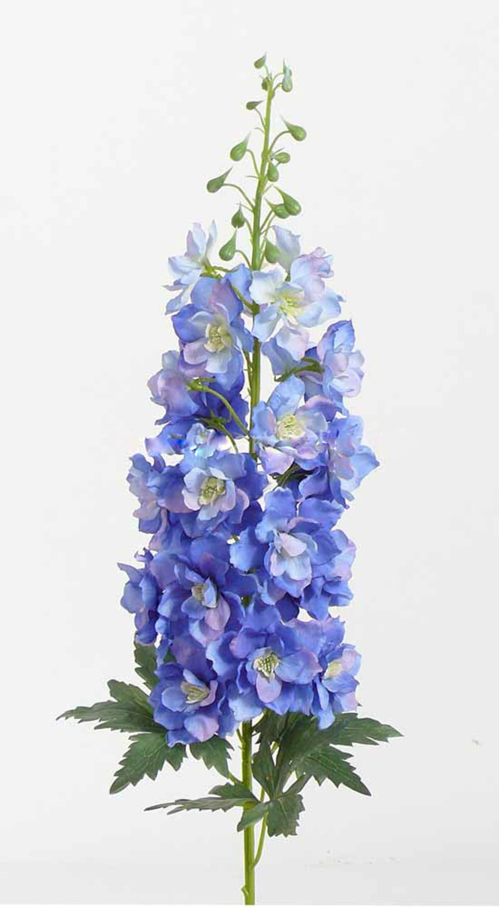 La flor de plástico Delphinium RIKKE en color de la flor azul-blanco tiene una longitud total de unos 95 cm. La flor de seda tiene un aspecto muy imponente y es muy adecuada para los jarrones de suelo.