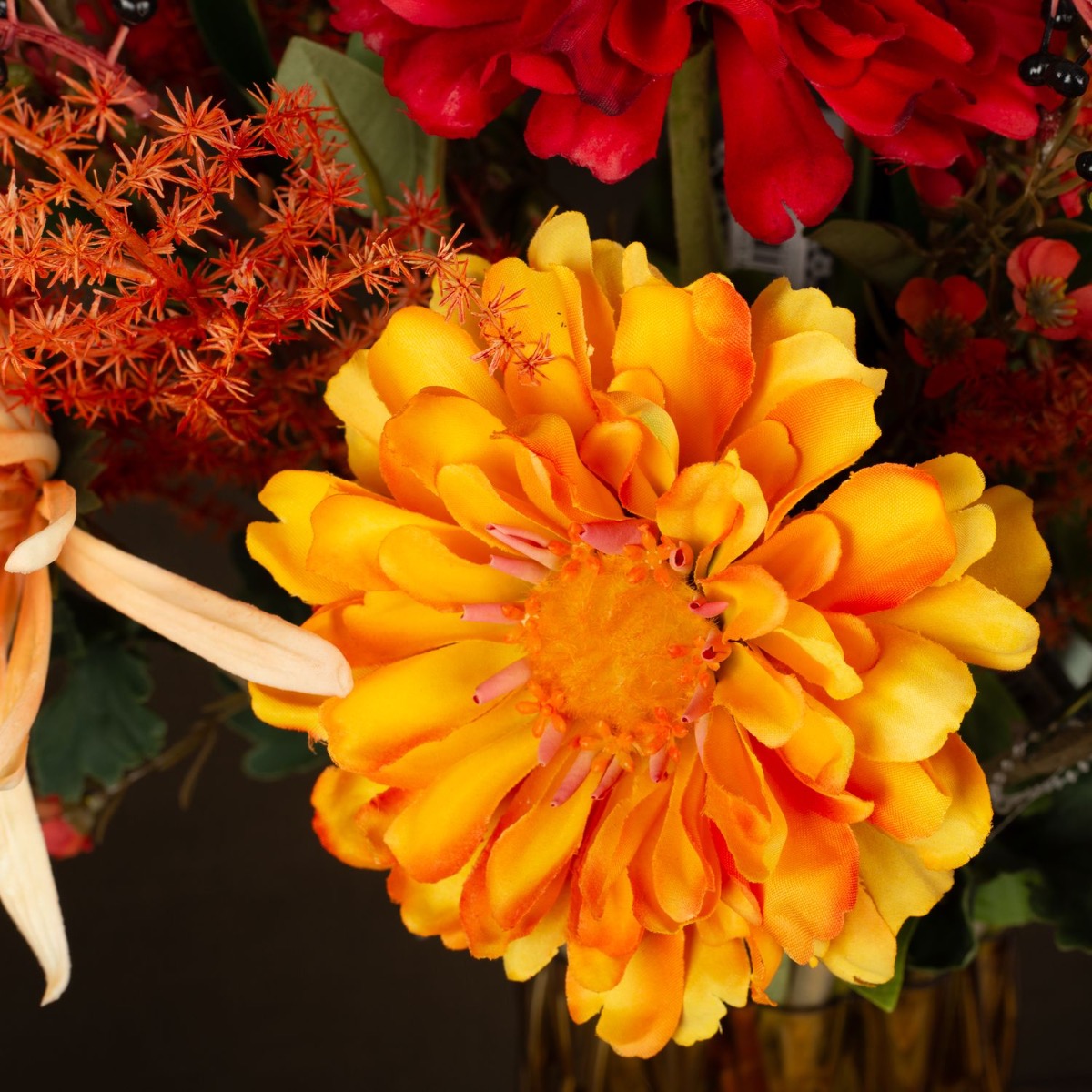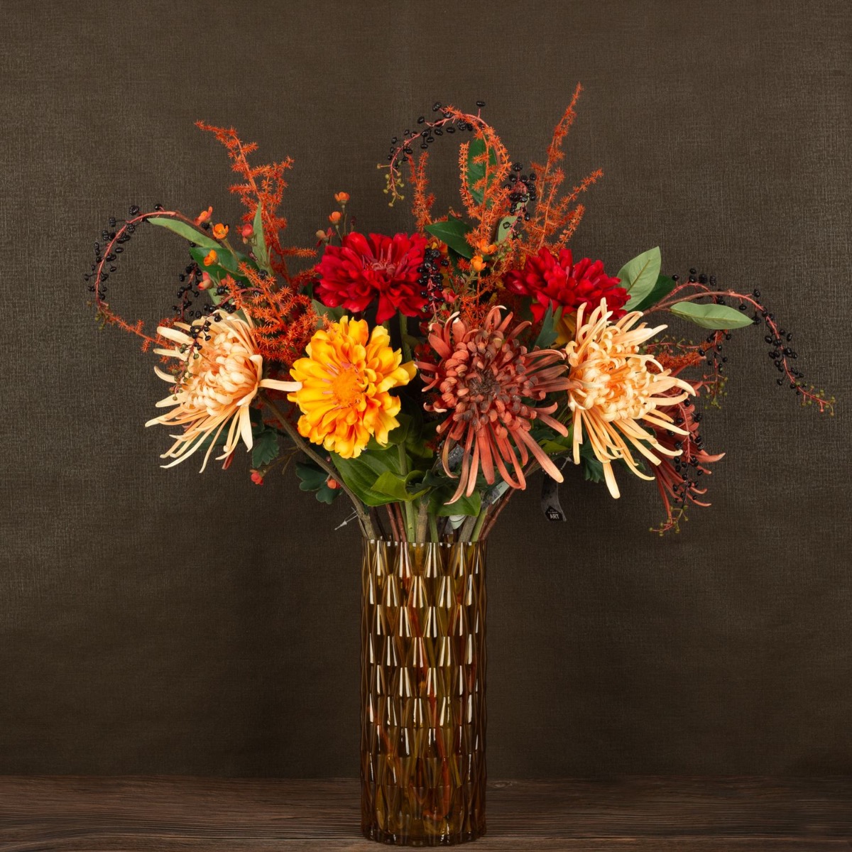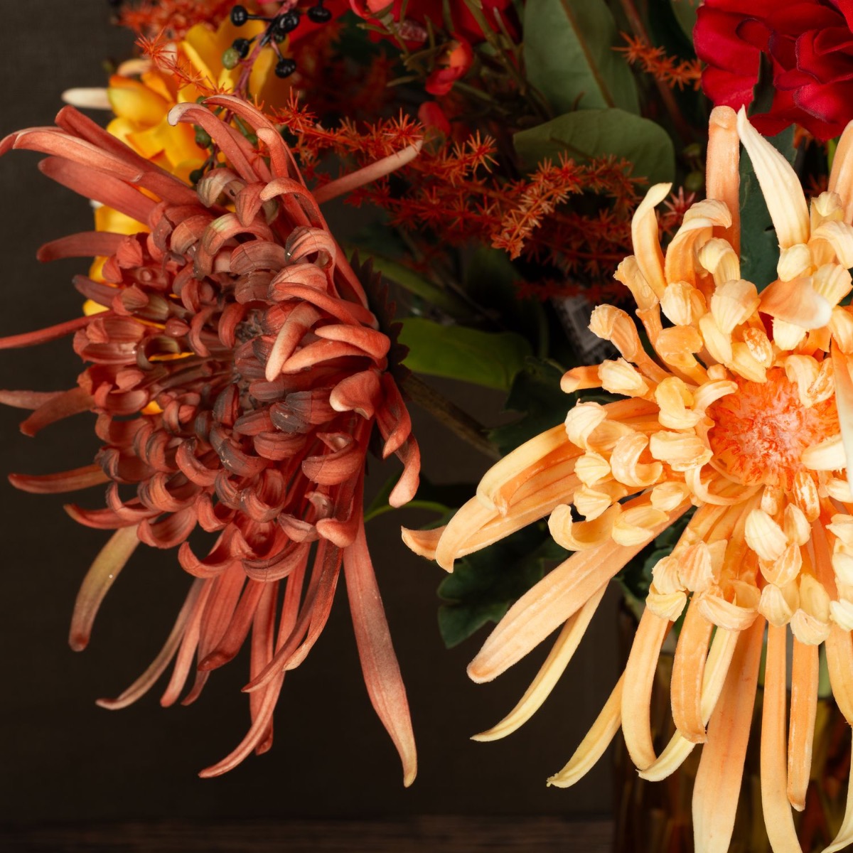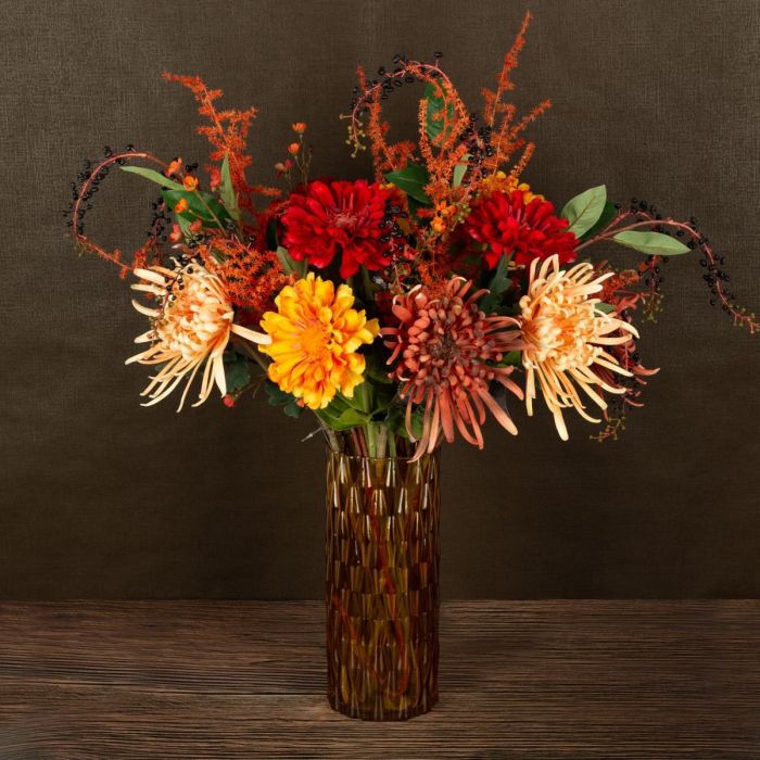 ¡Del albaricoque al rojo oscuro! Estos colores ardientes aportan calidez y luz al fresco y oscuro otoño. Flores típicas de finales de verano, como crisantemos y zinnias, que se han combinado con sus diversos rojos y los tonos anaranjados aparecen ante el fondo oscuro casi como una pintura al óleo impresionista. Ilumina tu hogar con esta naturaleza de belleza clásica ¡Compra el look!