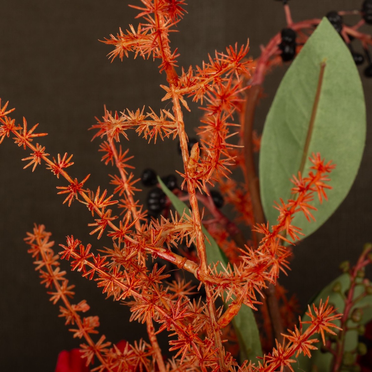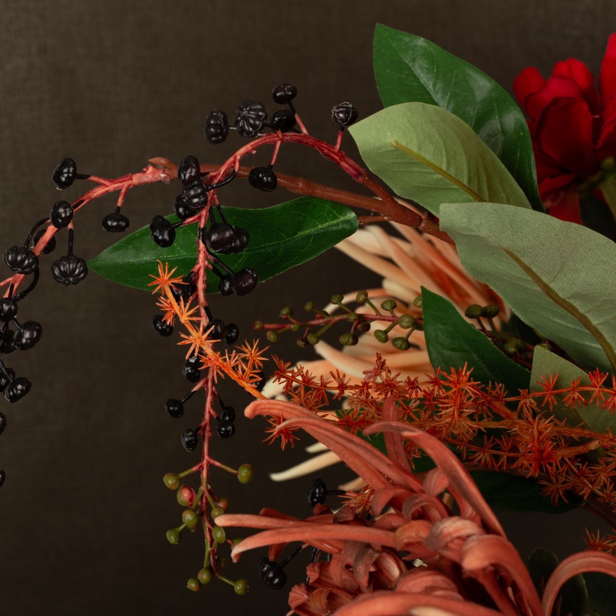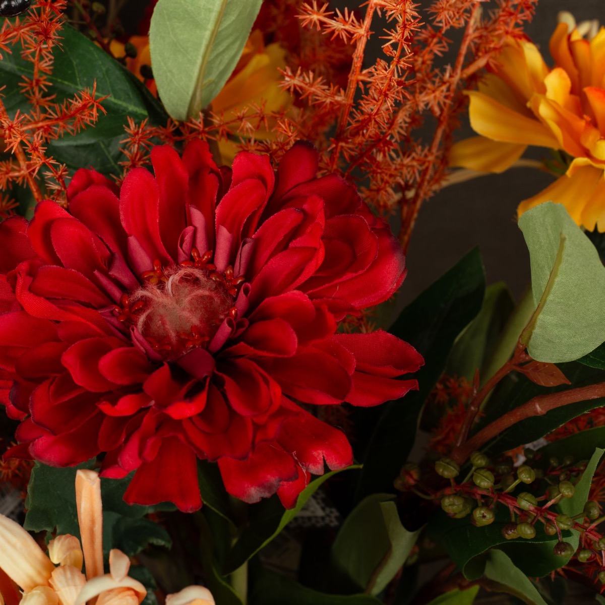 ¡Del albaricoque al rojo oscuro! Estos colores ardientes aportan calidez y luz al fresco y oscuro otoño. Flores típicas de finales de verano, como crisantemos y zinnias, que se han combinado con sus diversos rojos y los tonos anaranjados aparecen ante el fondo oscuro casi como una pintura al óleo impresionista. Ilumina tu hogar con esta naturaleza de belleza clásica ¡Compra el look!