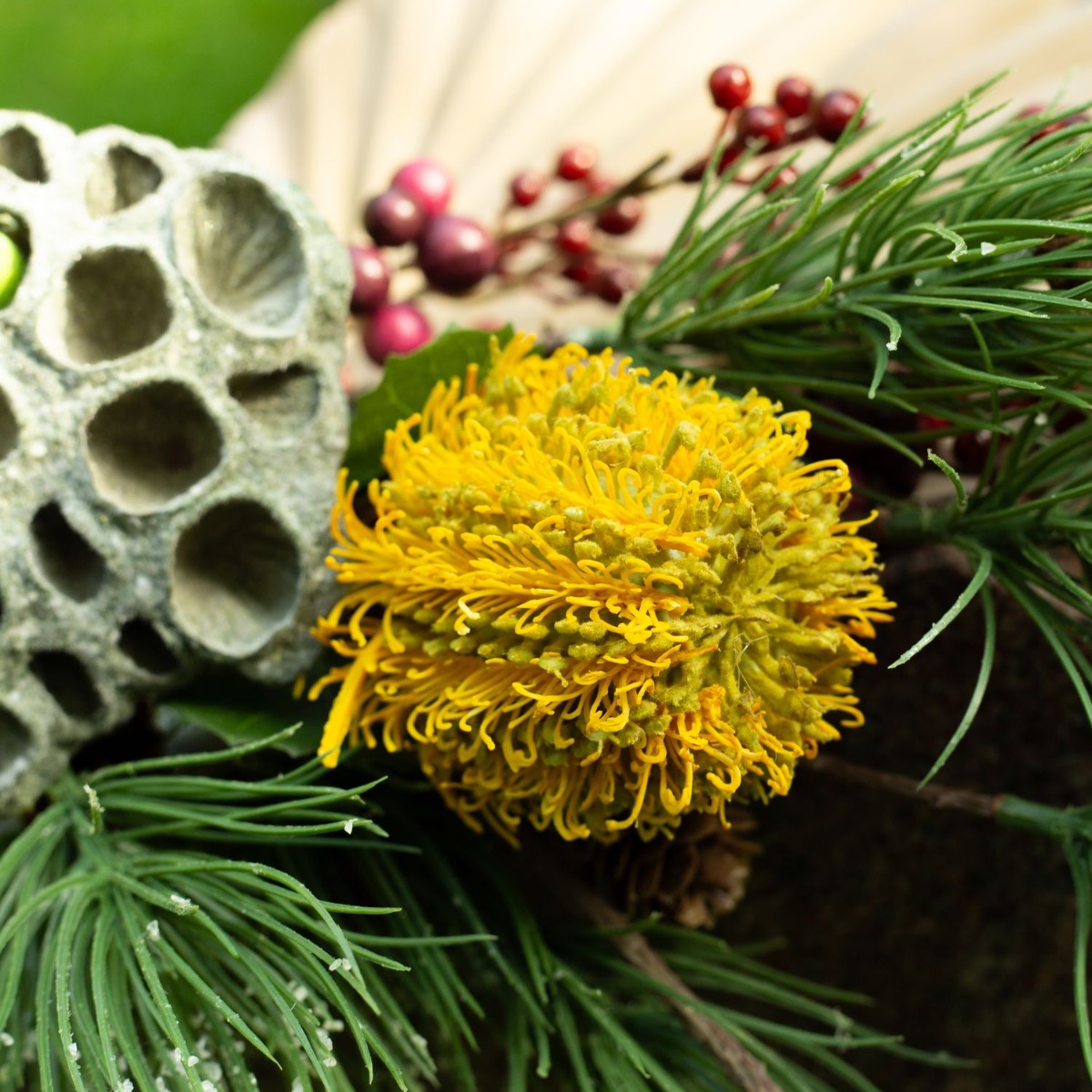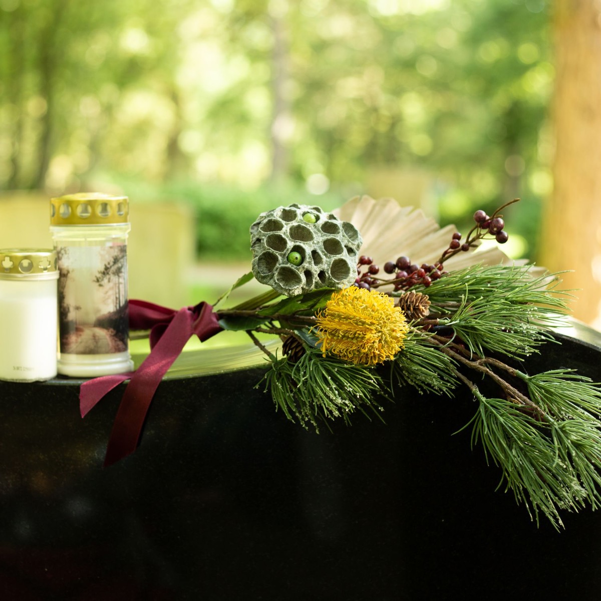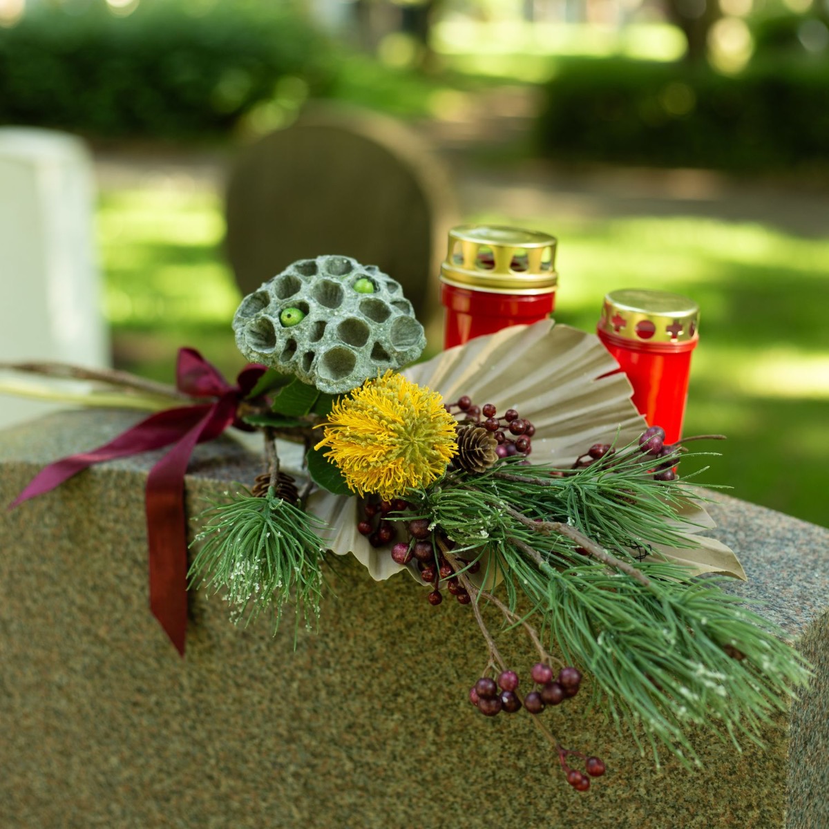 ¡Los colores del luto! Cuando se pierde a un ser querido, la vida cambia significativamente. Lo que queda es el recuerdo. El Día de Todos los Santos conmemoramos a los difuntos y recordamos vidas maravillosas. Las tumbas se cuidan y se decoran con flores nuevas. Es muy práctico que las flores no se marchiten y adornen la tumba permanentemente. No se marchitan, no hay que regarlas... y el efecto es realmente natural. La flor de banksia amarilla brilla intensamente en este pequeño ramo y confiere al ramo otoñal un aspecto extraordinario. La rama de abeto, las bayas de symphoricarpos y el fruto de loto están enmarcados por la hoja de palmera de color tierra y tienen un aspecto realmente único. ¡Compra el look!