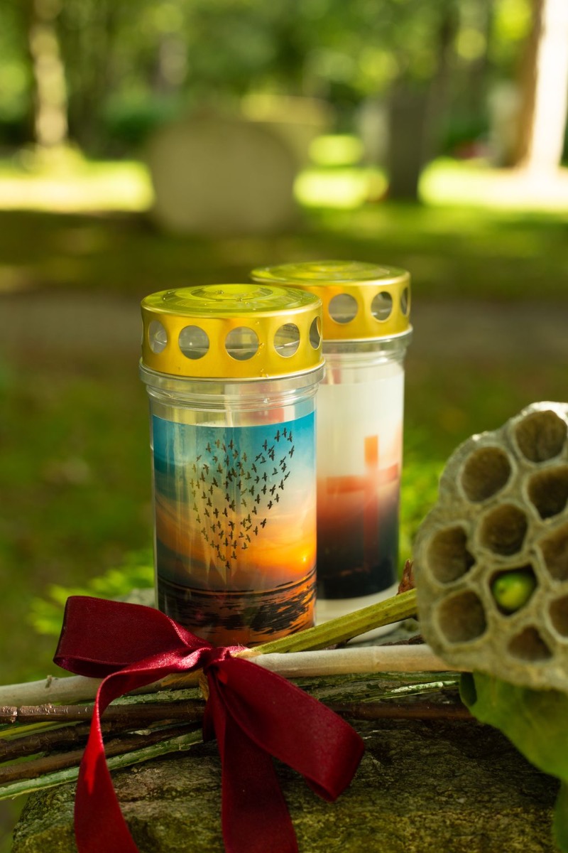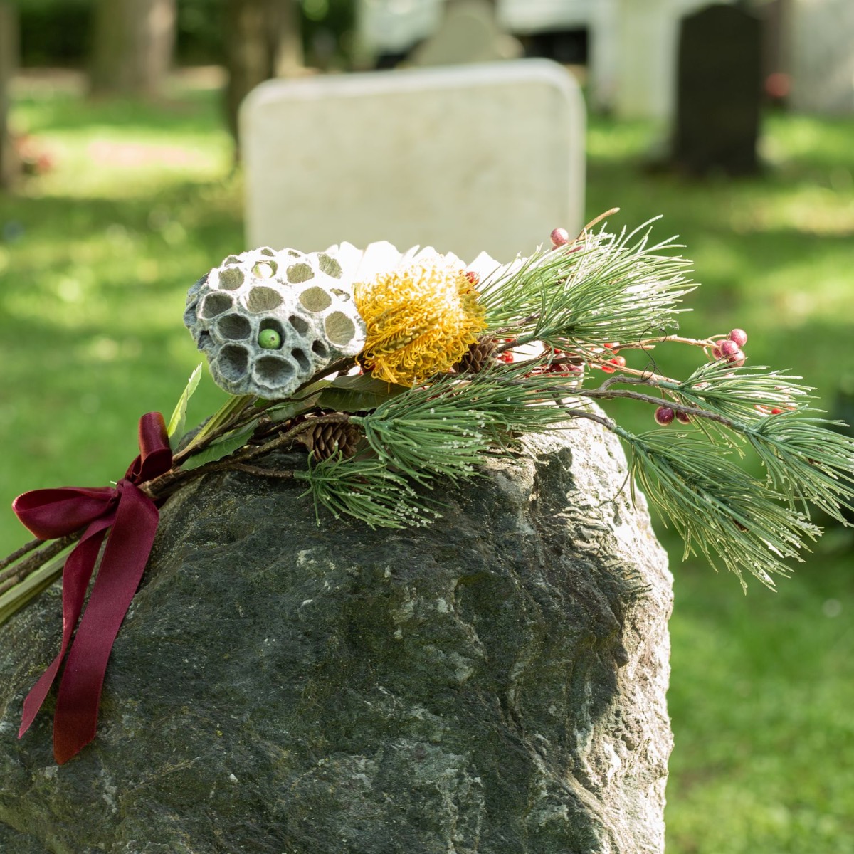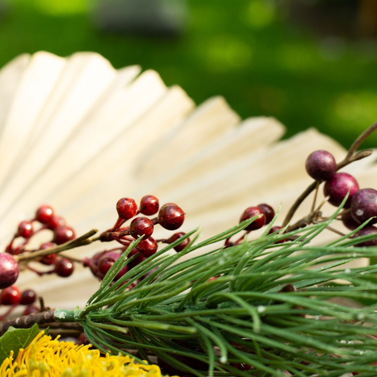 ¡Los colores del luto! Cuando se pierde a un ser querido, la vida cambia significativamente. Lo que queda es el recuerdo. El Día de Todos los Santos conmemoramos a los difuntos y recordamos vidas maravillosas. Las tumbas se cuidan y se decoran con flores nuevas. Es muy práctico que las flores no se marchiten y adornen la tumba permanentemente. No se marchitan, no hay que regarlas... y el efecto es realmente natural. La flor de banksia amarilla brilla intensamente en este pequeño ramo y confiere al ramo otoñal un aspecto extraordinario. La rama de abeto, las bayas de symphoricarpos y el fruto de loto están enmarcados por la hoja de palmera de color tierra y tienen un aspecto realmente único. ¡Compra el look!