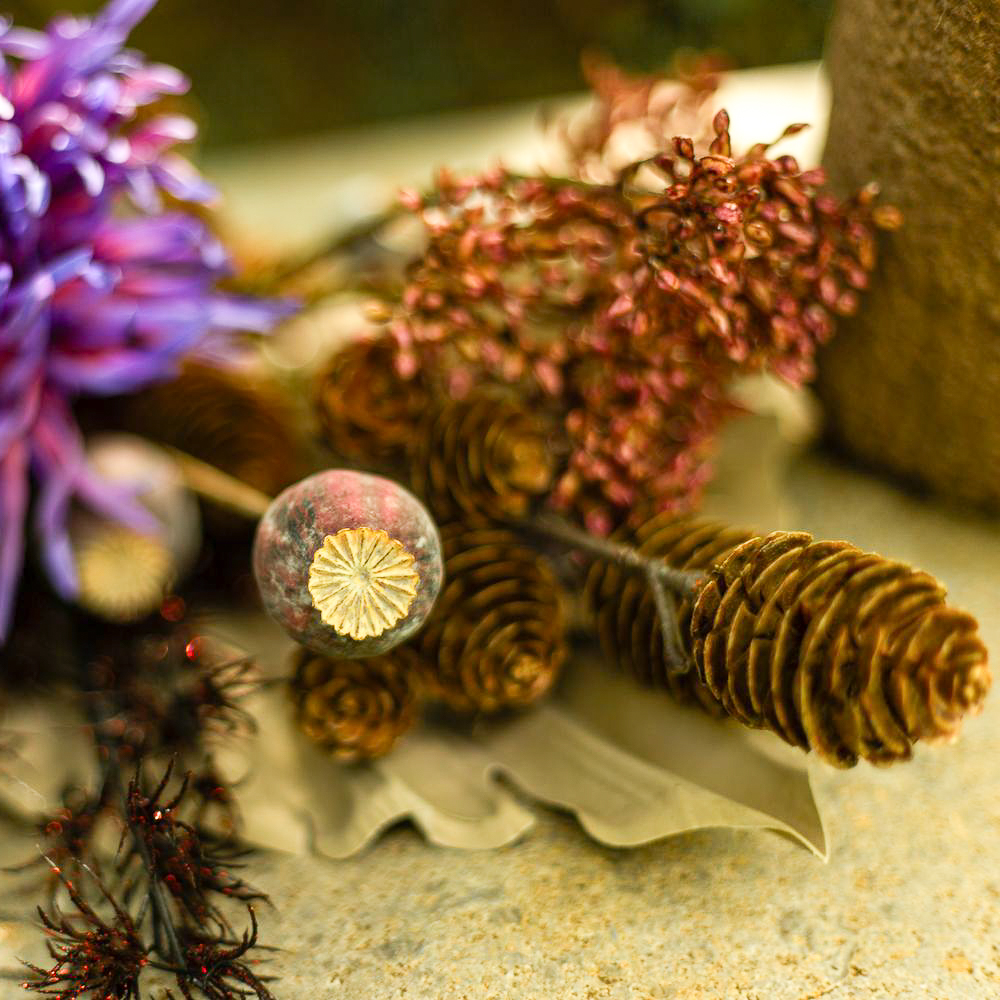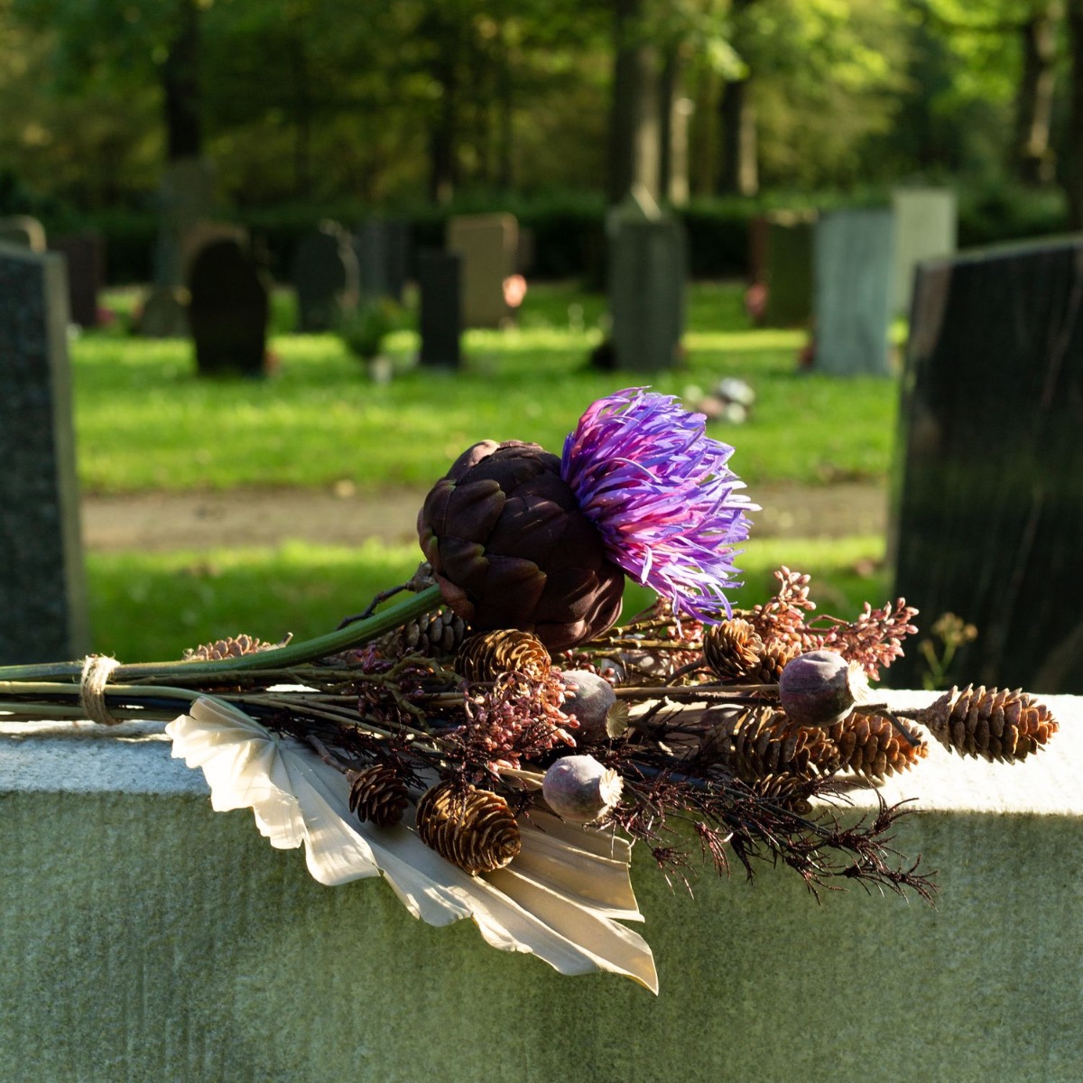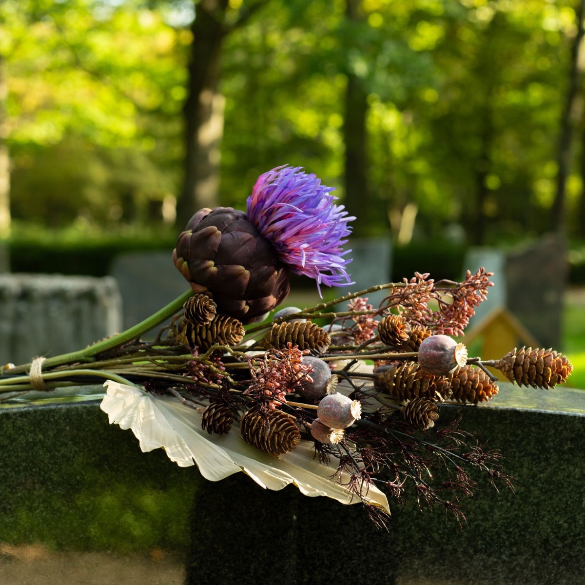 ¡Los colores del luto! Cuando se pierde a un ser querido, la vida cambia significativamente. Lo que queda es el recuerdo. El Día de Todos los Santos conmemoramos a los difuntos y recordamos vidas maravillosas. Las tumbas se cuidan y se decoran con flores nuevas. Es muy práctico que las flores no se marchiten y adornen la tumba permanentemente. No se marchitan, no hay que regarlas... y el efecto es realmente natural. El misterioso color púrpura de la flor de la alcachofa resplandece en la oscuridad del cementerio y resulta a la vez moderno frente a las hojas de palma de color tierra. ¡Compra el look!