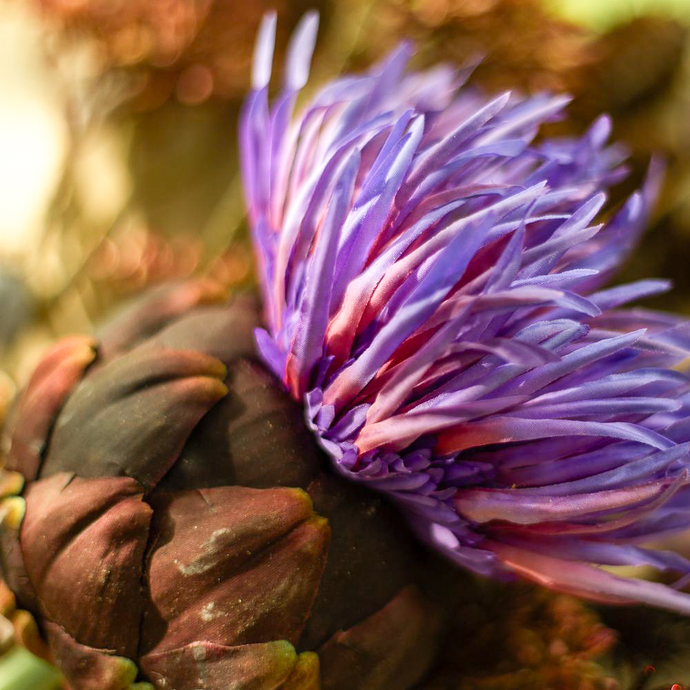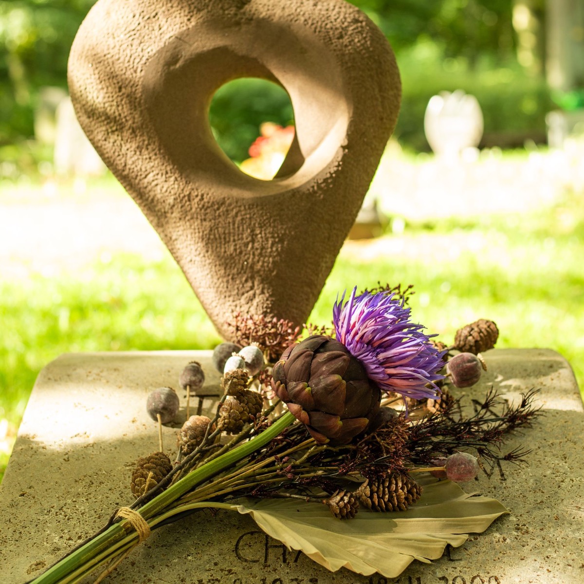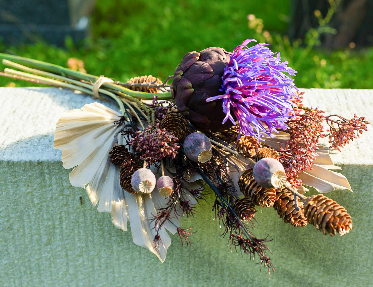 ¡Los colores del luto! Cuando se pierde a un ser querido, la vida cambia significativamente. Lo que queda es el recuerdo. El Día de Todos los Santos conmemoramos a los difuntos y recordamos vidas maravillosas. Las tumbas se cuidan y se decoran con flores nuevas. Es muy práctico que las flores no se marchiten y adornen la tumba permanentemente. No se marchitan, no hay que regarlas... y el efecto es realmente natural. El misterioso color púrpura de la flor de la alcachofa resplandece en la oscuridad del cementerio y resulta a la vez moderno frente a las hojas de palma de color tierra. ¡Compra el look!