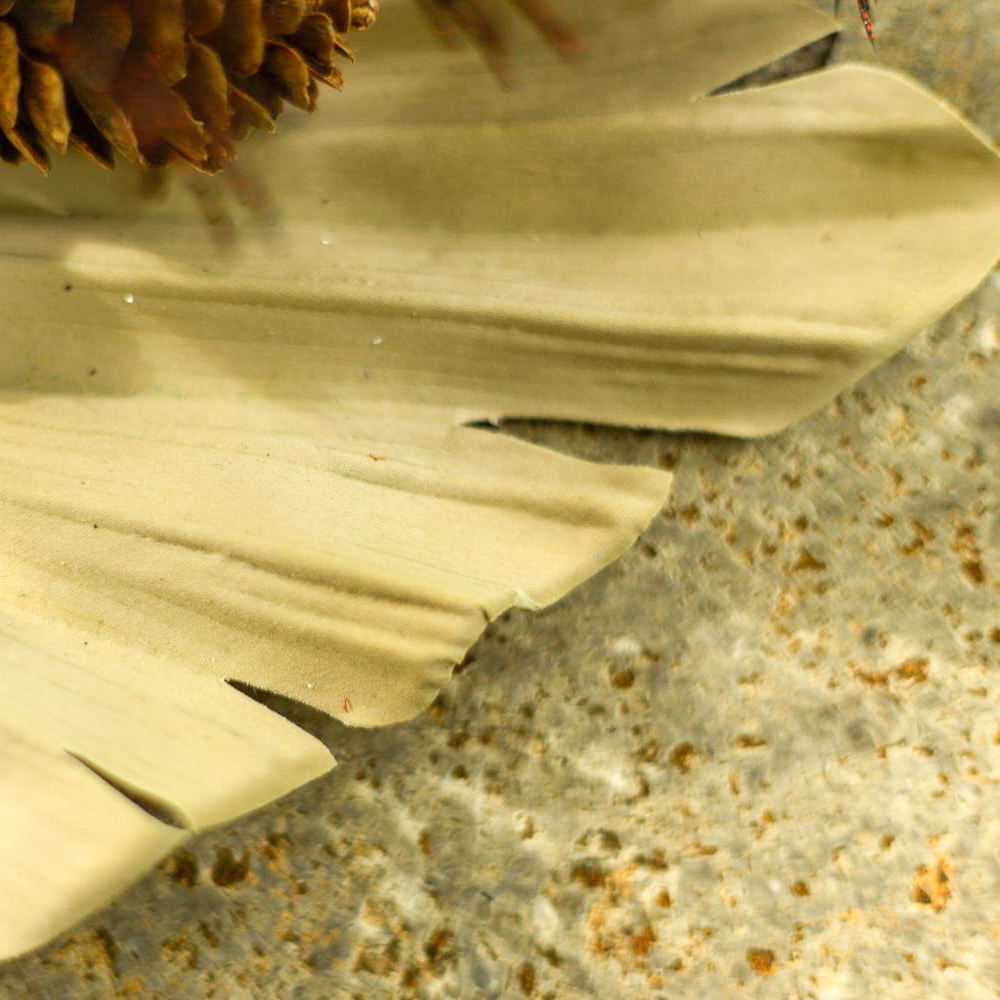 Consejo de decoración: Coloca la flor principal (flor de alcachofa) en primer plano y la hoja de palmera en segundo plano. Los accesorios se colocan en medio y deben enmarcar discretamente la flor de alcachofa.