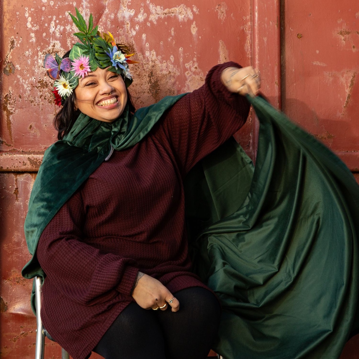¡Flores exóticas y una sonrisa ganadora! Este look se creó en realidad como corona de cumpleaños para nuestro querido jefe. Cualquiera que haga tanto por sus empleados se merece una corona. Pero él no quería ser el modelo. Así que sin más preámbulos, coronamos con ella a nuestra nueva modelo de la casa. Mary Lou se ve muy bien como modelo. No tuvo que practicar el look real de antemano. ¡Compra el look!
