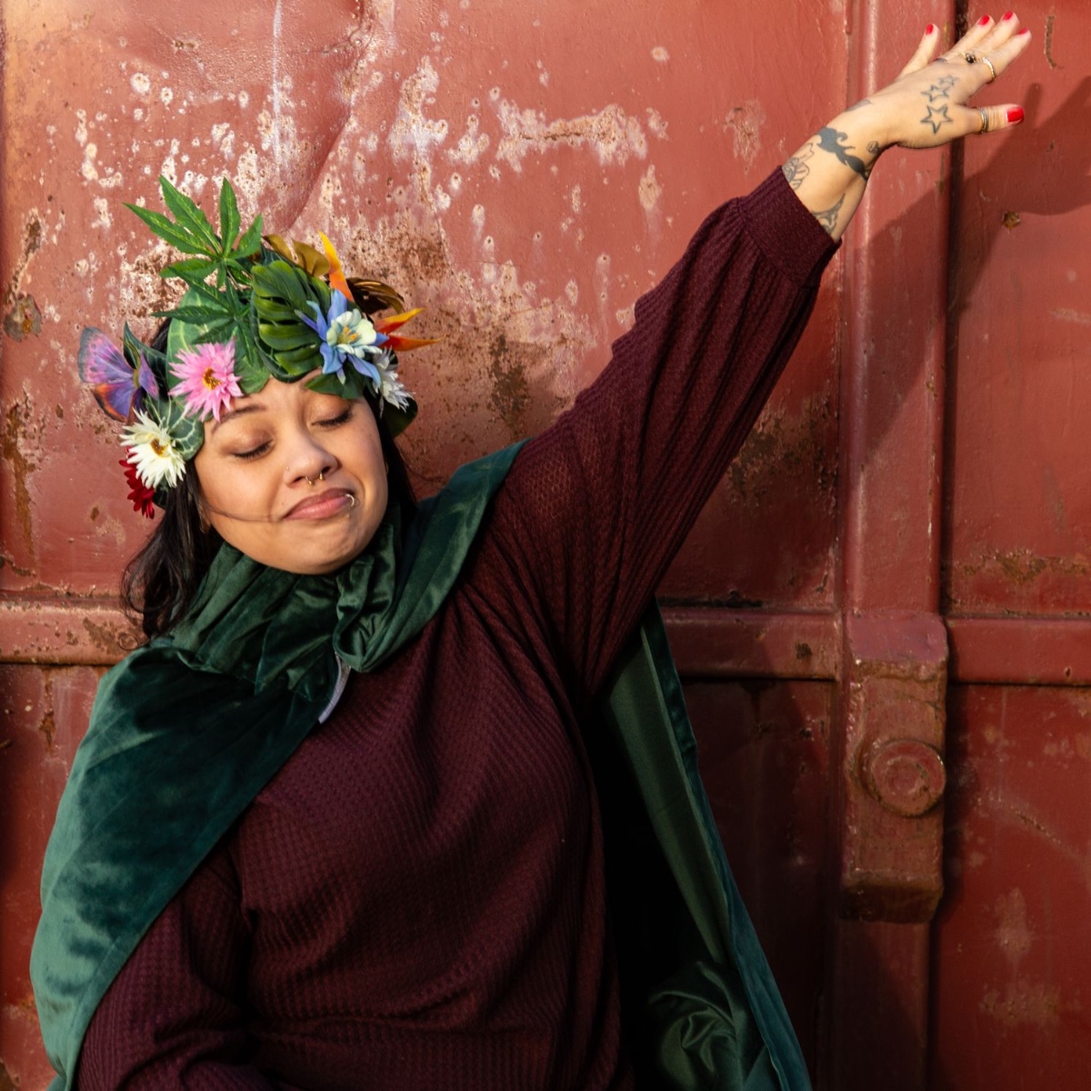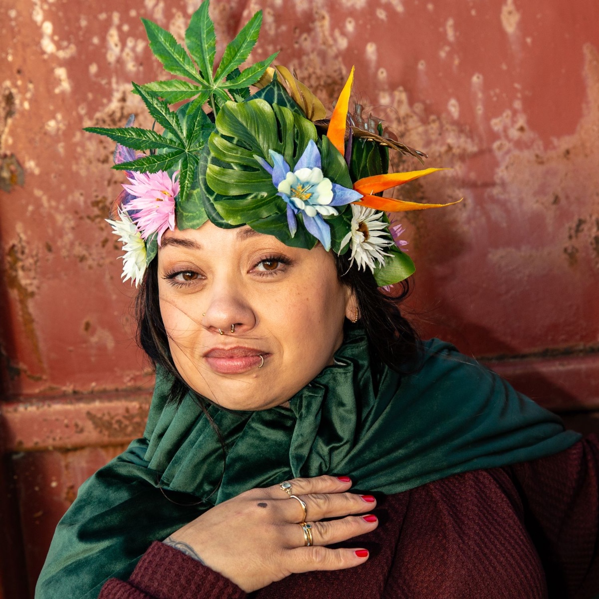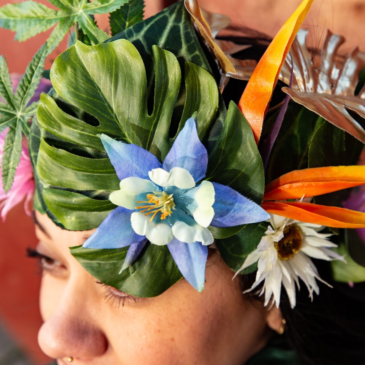 Consejo de diseño: Haz una corona de cartón o de una tela de fieltro firme. Para ello, mide primero la circunferencia de la cabeza. Por lo general, también puedes pegarle velcro, para que pueda utilizarse de forma universal. Empezamos pegando hojas de filodendro, arce japonés y calathea en la corona para que luego no se vea tanto el cartón o el fieltro. A continuación, pegamos las flores con la pistola de cola caliente. Incluso hay una mariposa en la corona.