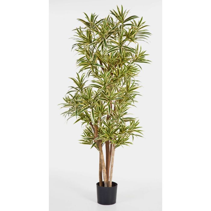La Dracaena YASU posee varias hojas de color verde y amarillo de forma alargada con un tronco real de madera en color marrón. Con su altura de 180 cm, aproximadamente, la bonita Drácena es perfecta para decorar centros de Wellness, despachos y mucho más.