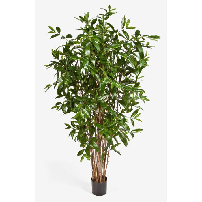 Drácena manchada (Dracaena surculosa) artificial con hojas en color verde y muchas ramificaciones. El árbol decorativo tiene aprox. 1150 hojas y junto con el tiesto mide un total aproximado de 180 cm de alto.