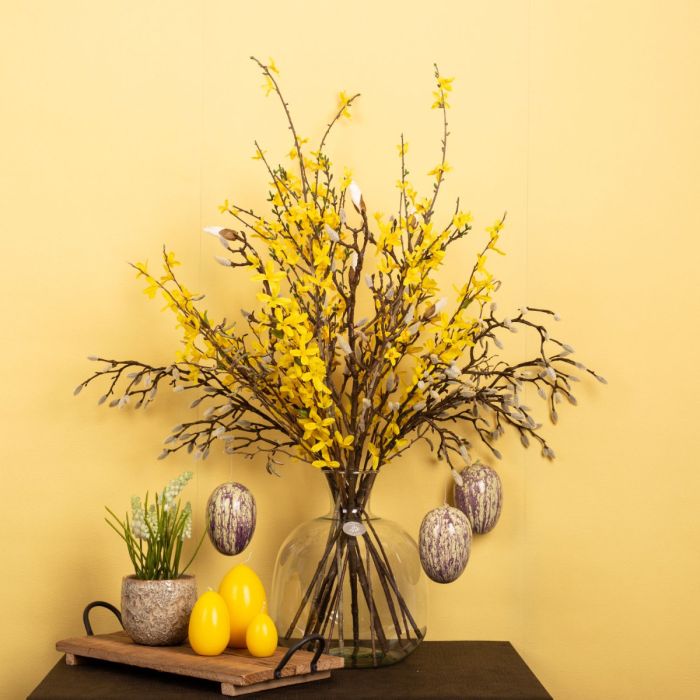 ¡Simple y natural! El largo invierno por fin ha terminado y los primeros rayos de sol evocan las primeras flores en la naturaleza. ¡Por fin vuelve a hacer calor! Las magnolias y las ramitas de abedul parecen recogidas a mano y son perfectas para colgar unos huevos de Pascua. Los jacintos blancos son realmente raros de ver en la naturaleza. Aquí combinan especialmente bien con los capullos blancos y esponjosos de la magnolia. Hemos ampliado este look con 5 ramas amarillas de forsythia. Se nota que la Pascua está cada vez más cerca. ¡Compra el look!