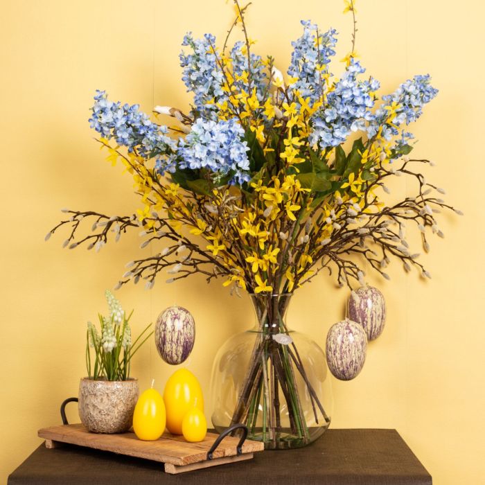 ¡Simple y natural! El largo invierno por fin ha terminado y los primeros rayos de sol evocan las primeras flores en la naturaleza. ¡Por fin vuelve a hacer calor! Las magnolias y las ramitas de abedul parecen recogidas a mano y son perfectas para colgar unos huevos de Pascua. Los jacintos blancos son realmente raros de ver en la naturaleza. Aquí combinan especialmente bien con los capullos blancos y esponjosos de la magnolia. Hemos ampliado este look con 5 ramas amarillas de forsythia y lilas azules. ¡Que empiece la caza de huevos de Pascua! Compre el look!