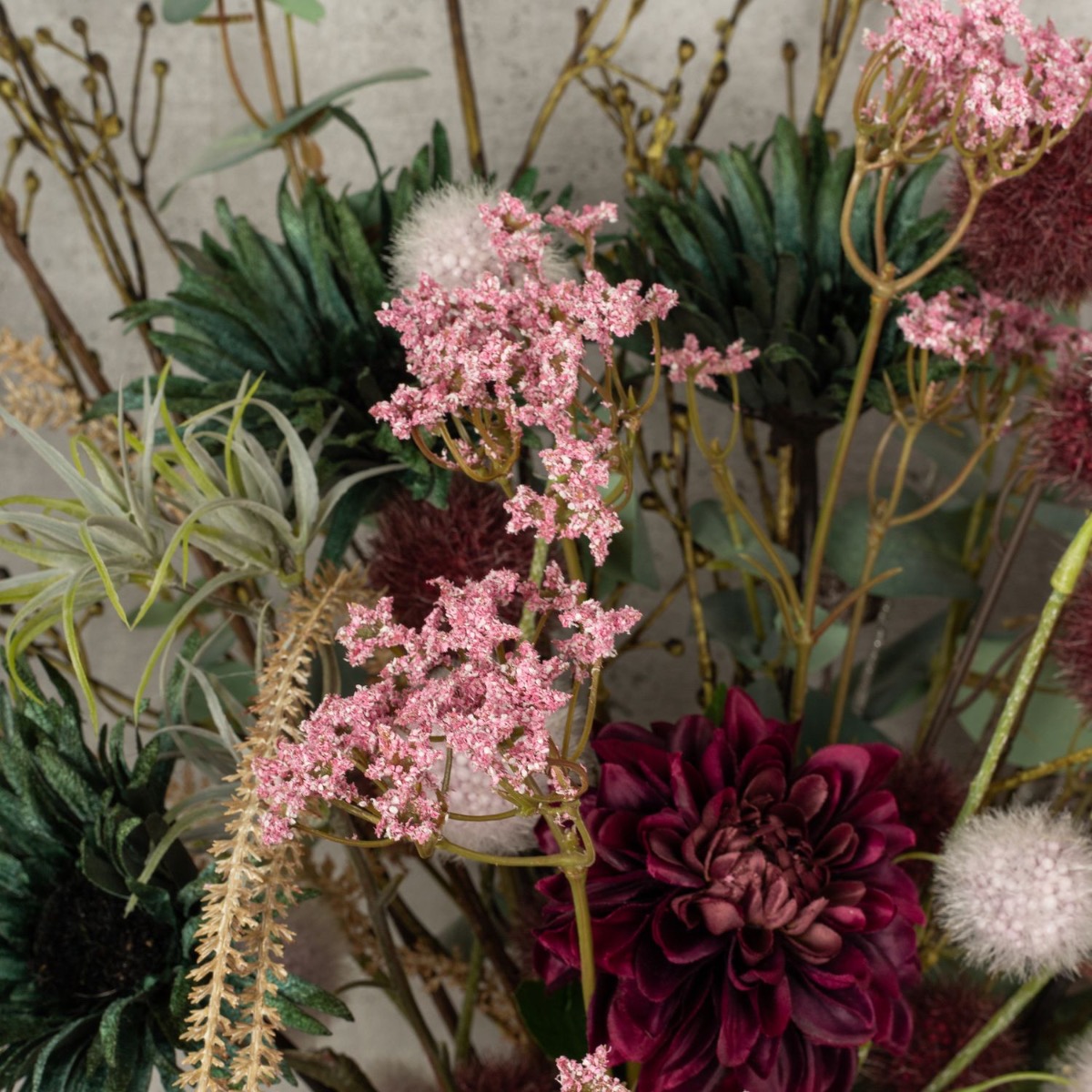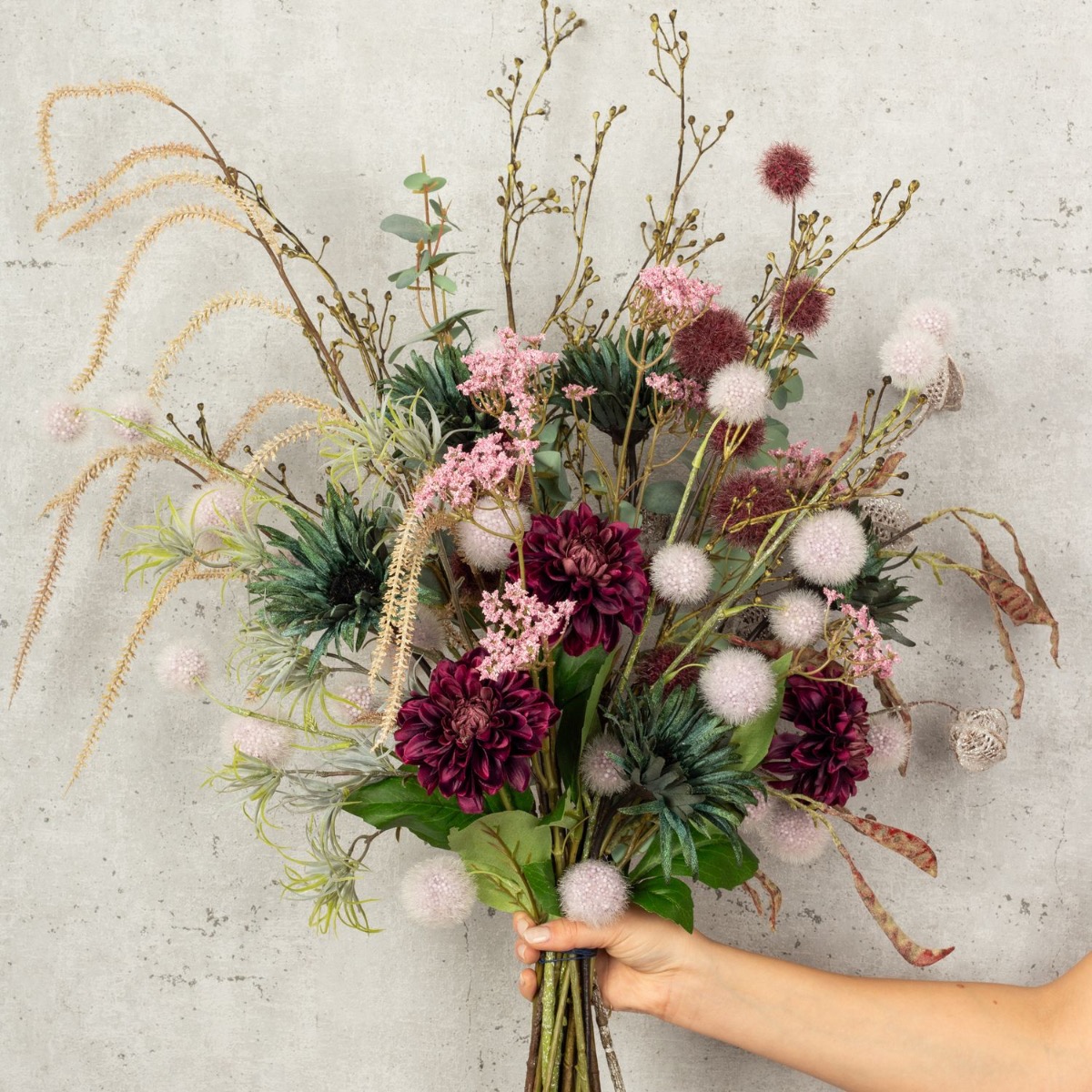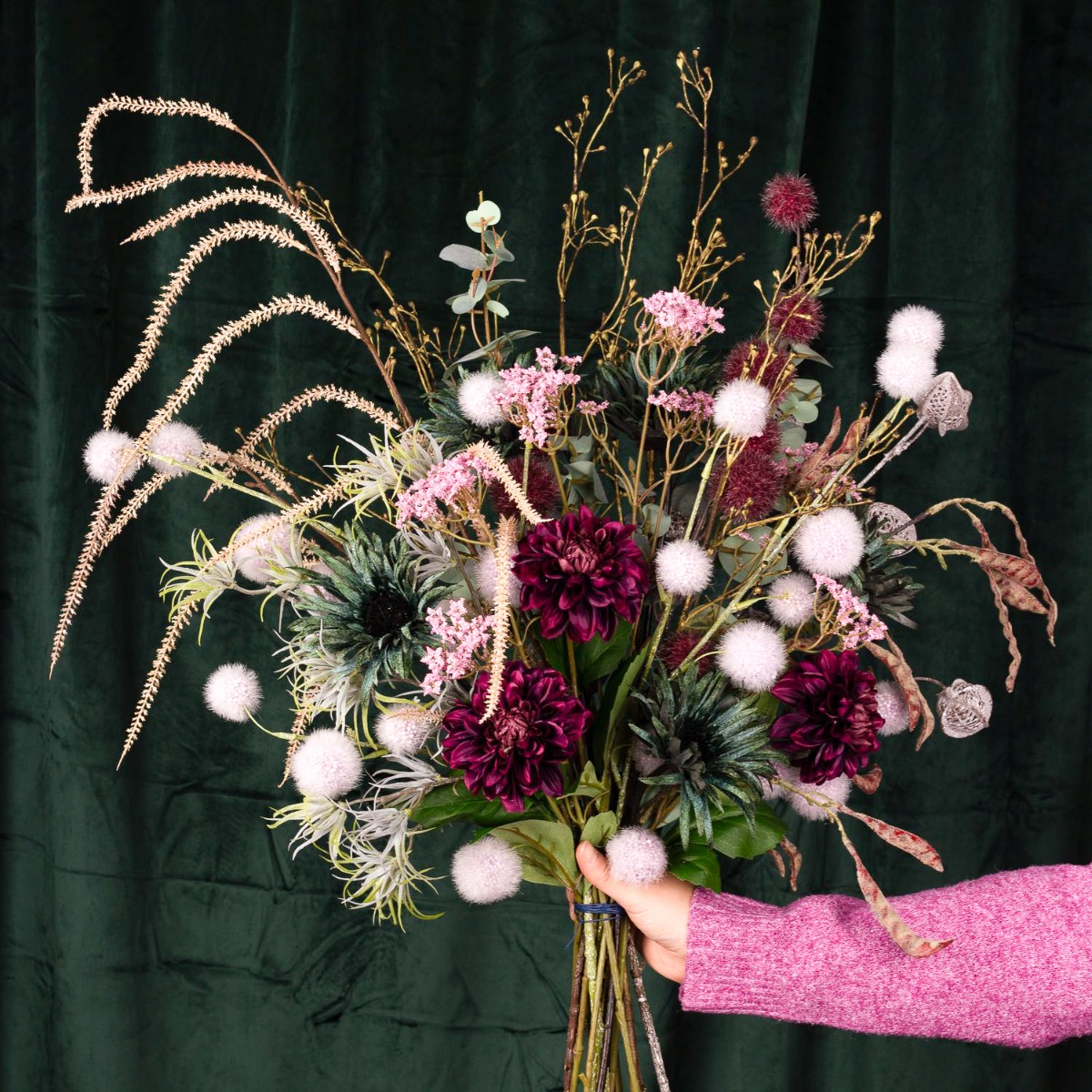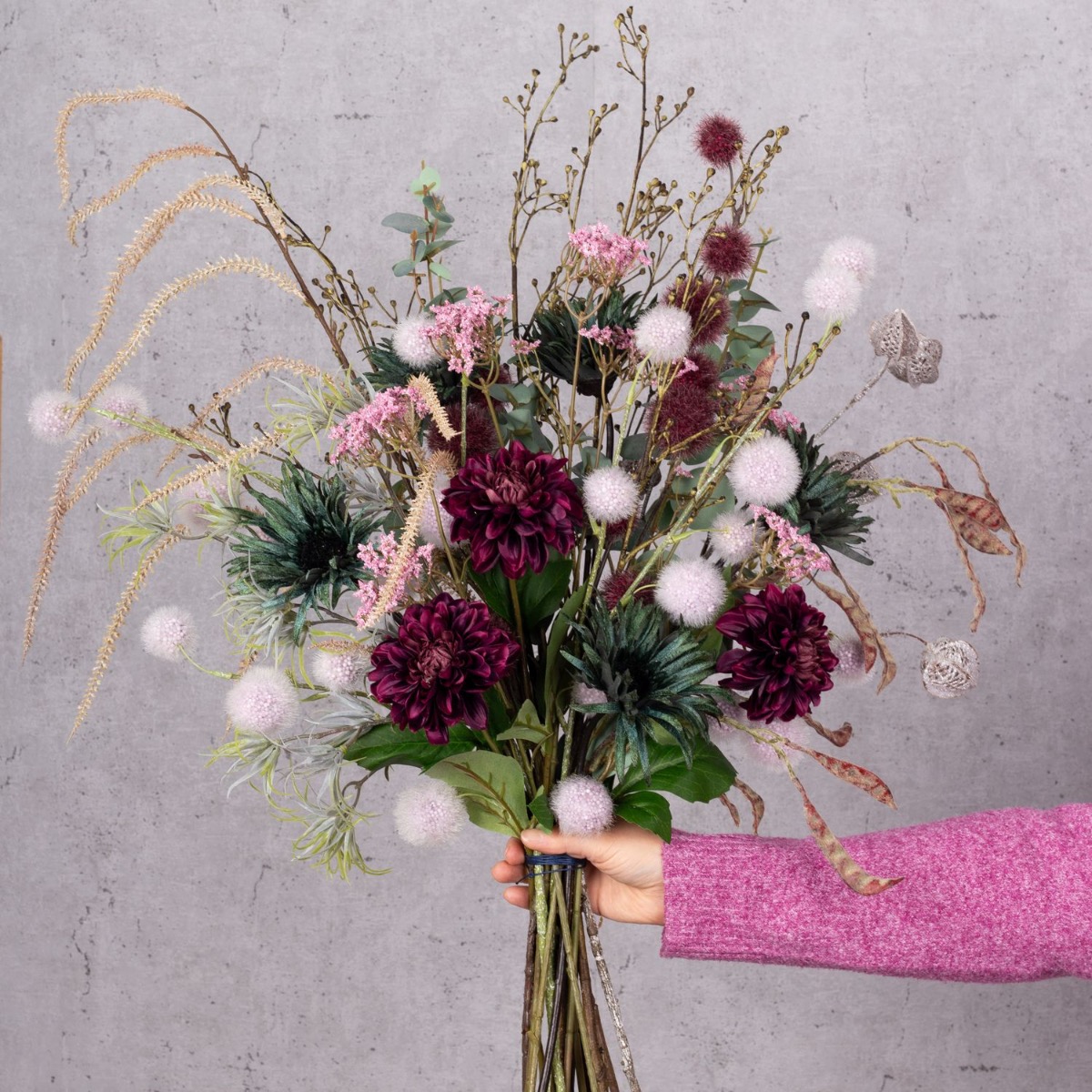 ¡Estilosa en cada estación! Esta nueva edición de uno de nuestros looks más vendidos ha recibido un nuevo aire. Las dalias son ahora de un vibrante tono fucsia y alegran el efecto general del ramo. Nuestro atmosférico look invernal se ha transformado en un look fresco para todo el año que, sencillamente, queda bien en todas partes. Nuestros clientes están encantados cada vez que tienen este ramo en sus manos. Compra el look!