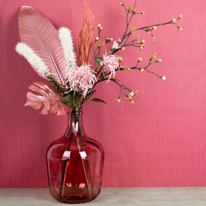 Polvo y colorete! Los colores típicos del verano suelen estar en la gama de los polvos. Los tonos rubor armonizan a la perfección con las brillantes hojas de color rosa metálico. Las flores de la rama de arce resplandecen tras el diseño monocromático del look y resultan realmente mágicas en cualquier habitación. Para redondear este look tan femenino, hemos optado por un globo de cristal de color rosa. Combina a la perfección con el fondo rosa antiguo. ¡Compra el look!